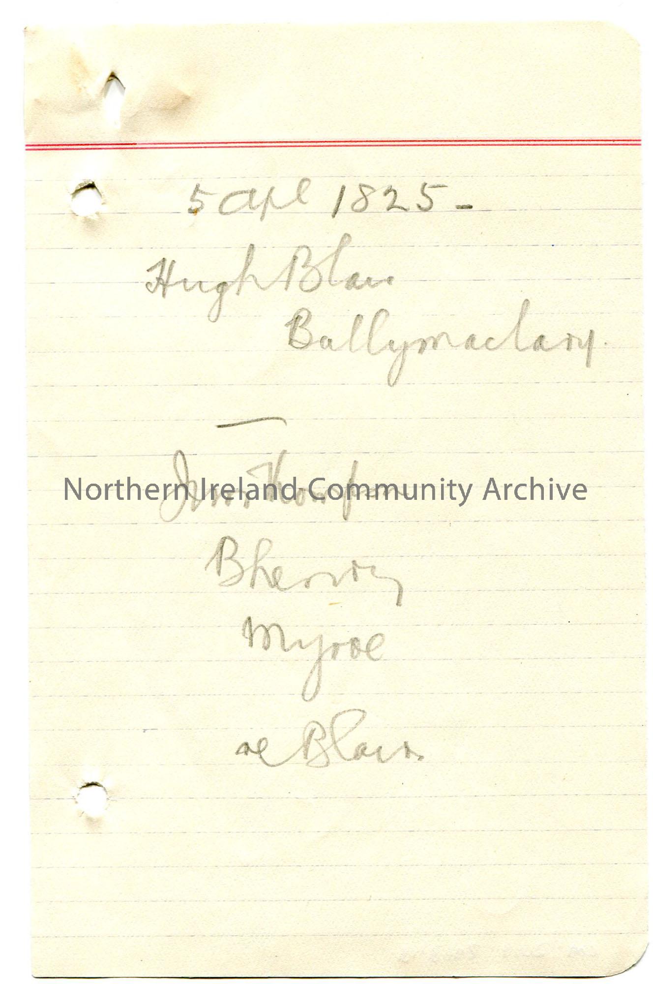 Page 15 of 15. Rough genealogical notes on lined paper in pencil from a notebook re Sam’s ‘Blair Inquiry’. Mentions Hugh Blair and John Blair. ‘Record…