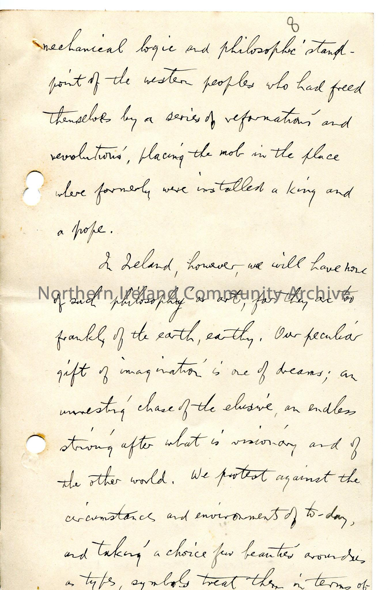 Page 15 of 24 page handwritten letter, on both sides of paper - author appears to have left Coleraine and now live in Glasgow. Mentions Irish Society School. Writes about classical music, Ibsen plays, a fanciful sketch his own, and Irish theatre, writers and myths and legends.
