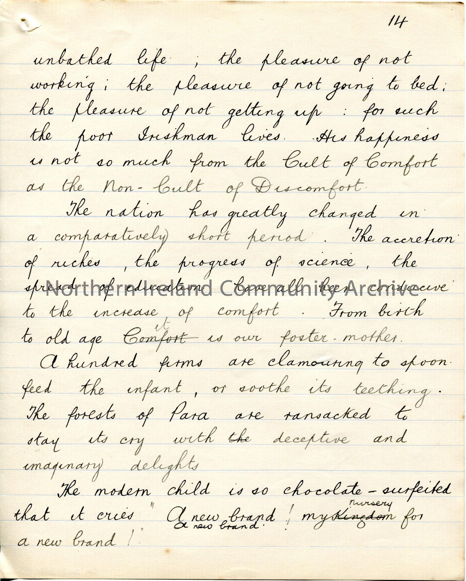 Page 15 of 39. Handwritten essay by Sam Henry titled, ‘The Cult of Comfort’. Title is scored out. Dated Omagh, December 1905. Religious, philosophical…