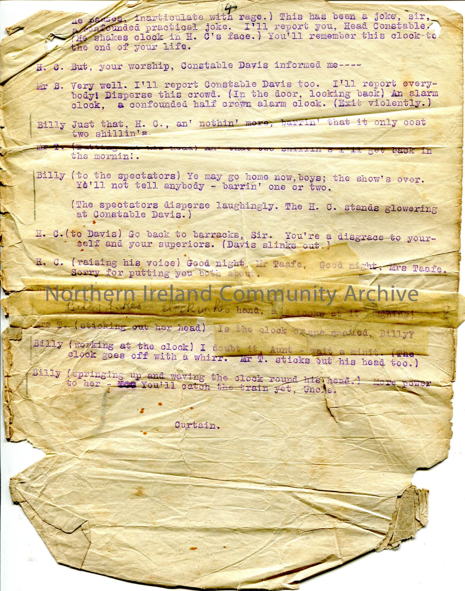 Page 16 of 16. Typed script for play ‘The Alarm Clock. A farce in one act by Lynn Doyle’. Re an alarm clock which is mistaken for an explosive device.