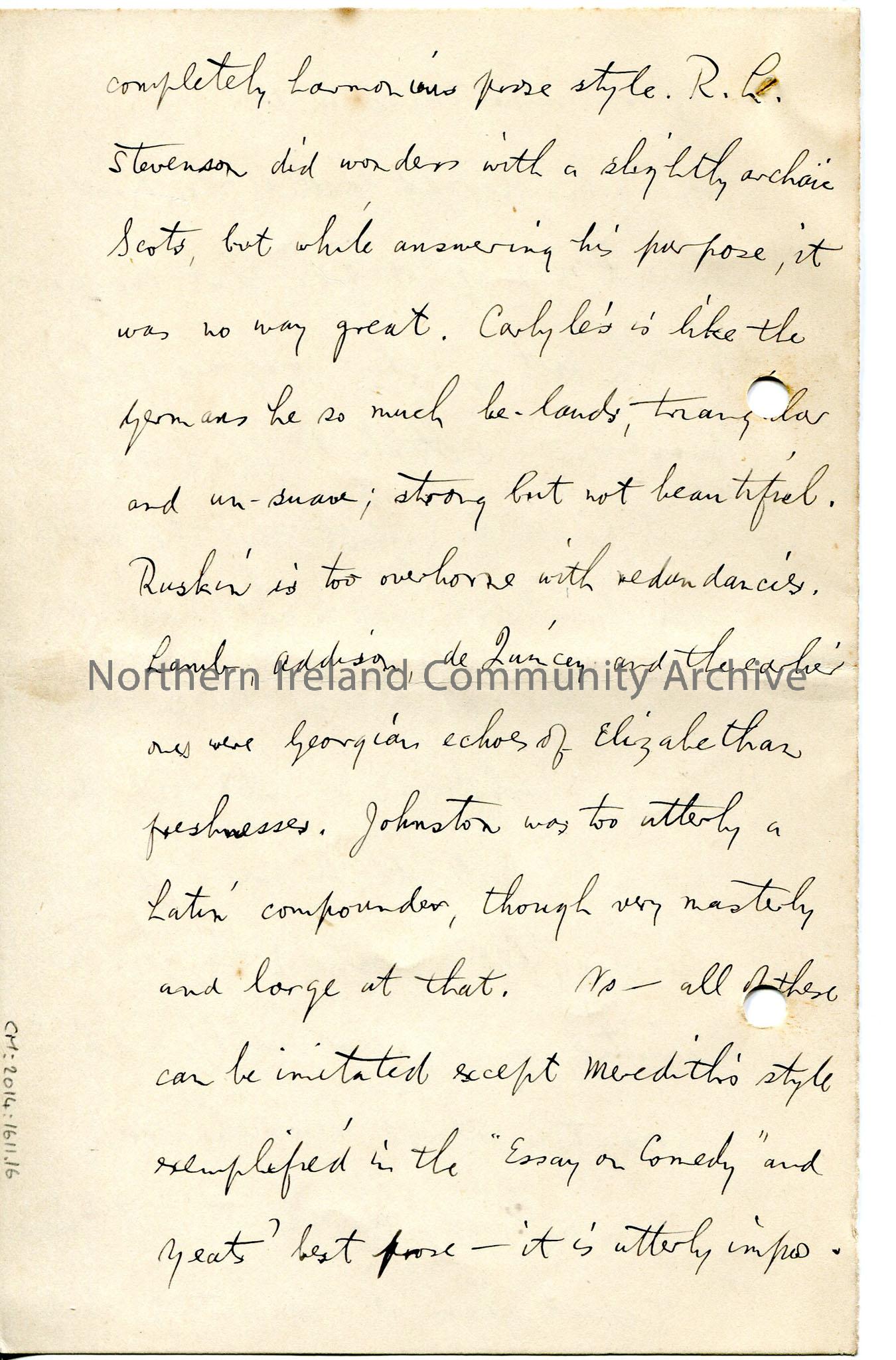 Page 16 of 24 page handwritten letter, on both sides of paper - author appears to have left Coleraine and now live in Glasgow. Mentions Irish Society School. Writes about classical music, Ibsen plays, a fanciful sketch his own, and Irish theatre, writers and myths and legends.