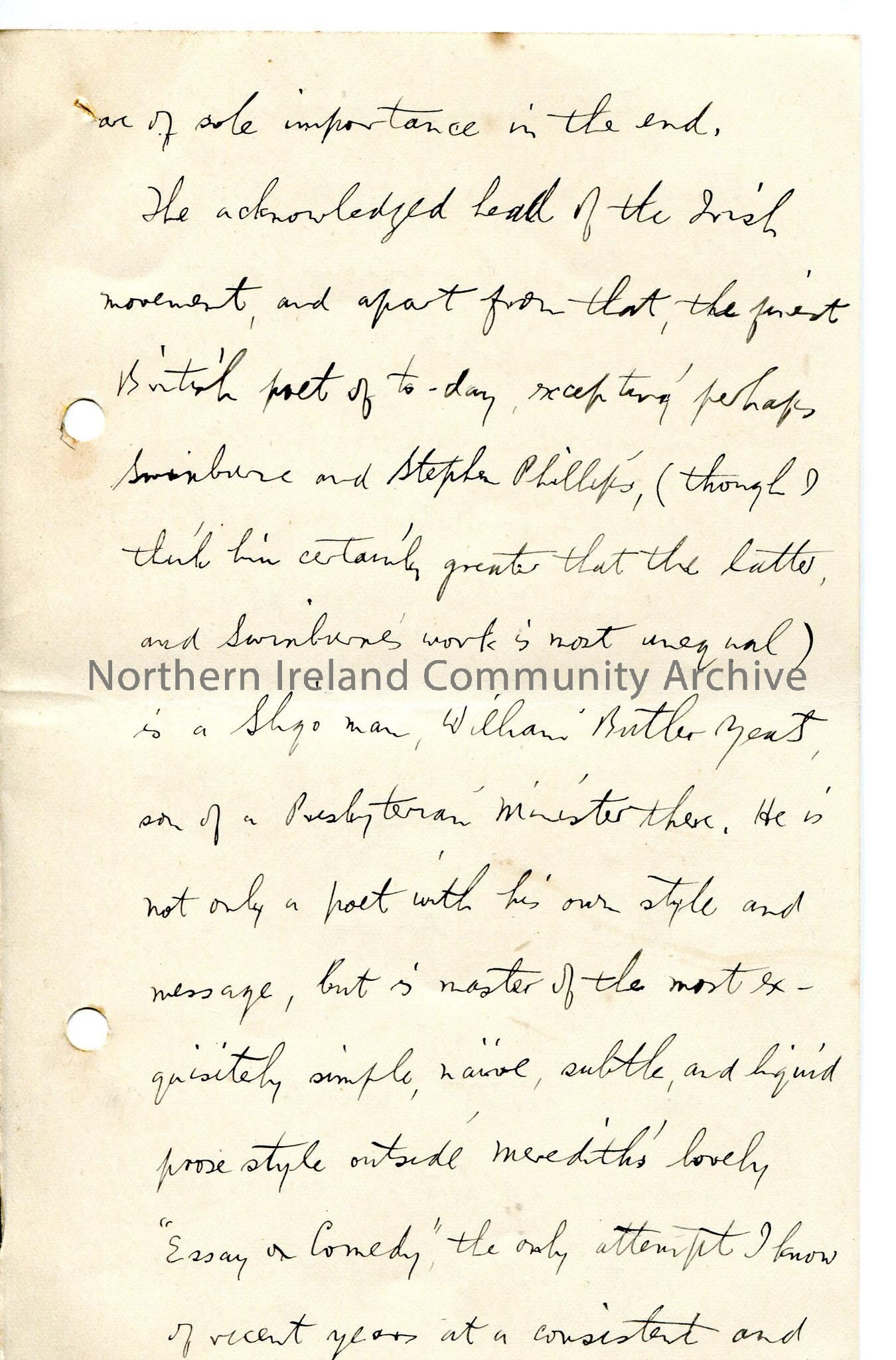 Page 16 of 24 page handwritten letter, on both sides of paper - author appears to have left Coleraine and now live in Glasgow. Mentions Irish Society School. Writes about classical music, Ibsen plays, a fanciful sketch his own, and Irish theatre, writers and myths and legends.