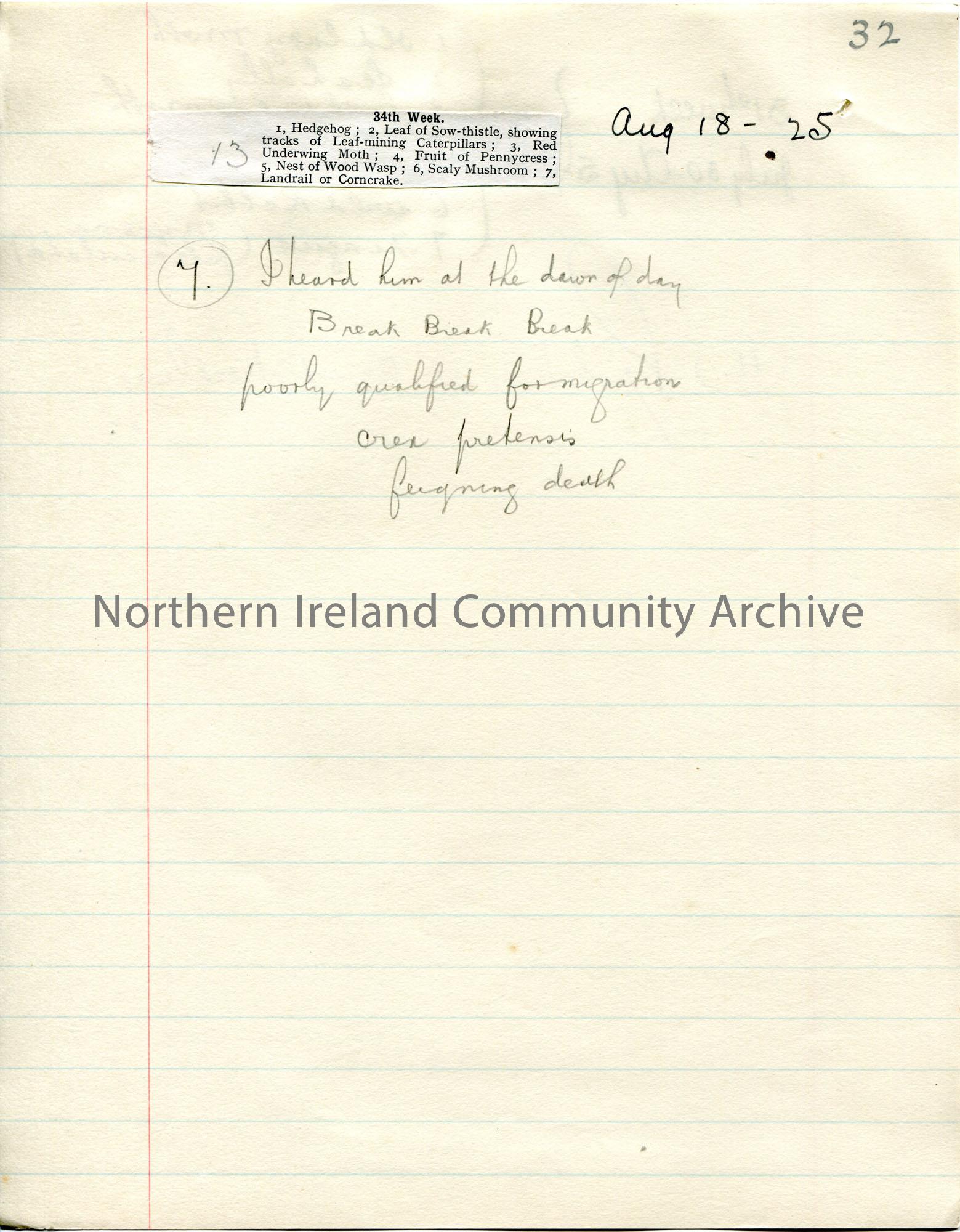 Page 16 of 26. Handwritten nature notes (double sided). Details correspond to each week of the year. Small cuttings from a publication are pasted to s… – scan020z