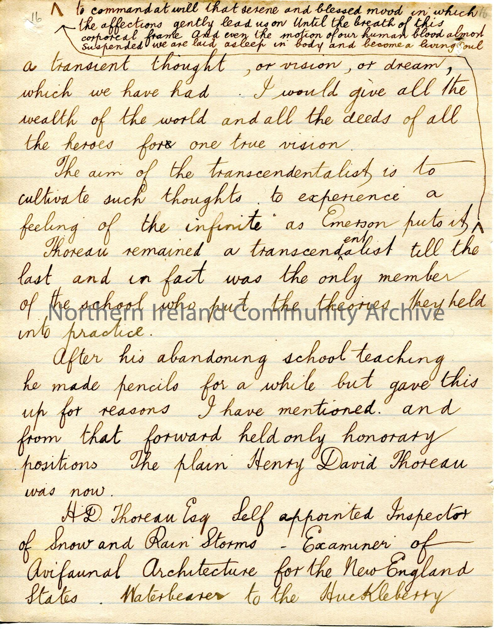 Page 16 of 38. Handwritten essay by Sam Henry titled, ‘The Hermit of Walden’. Philosophical essay re Henry David Thoreau. Sam presents this essay to t…