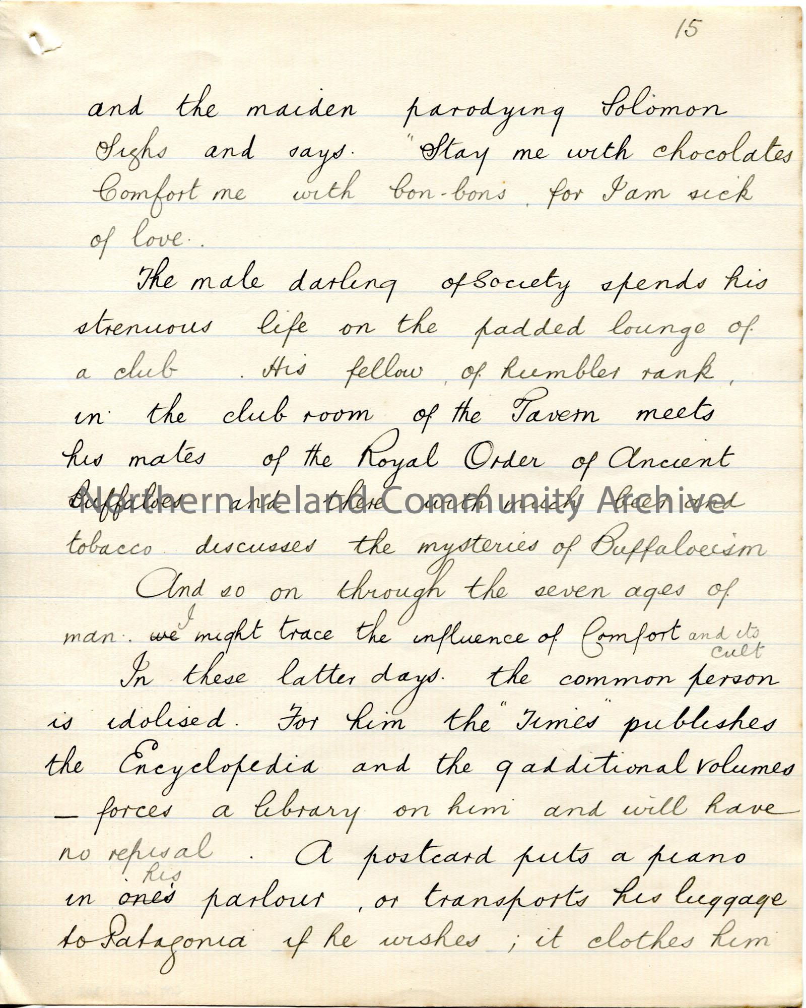 Page 16 of 39. Handwritten essay by Sam Henry titled, ‘The Cult of Comfort’. Title is scored out. Dated Omagh, December 1905. Religious, philosophical…