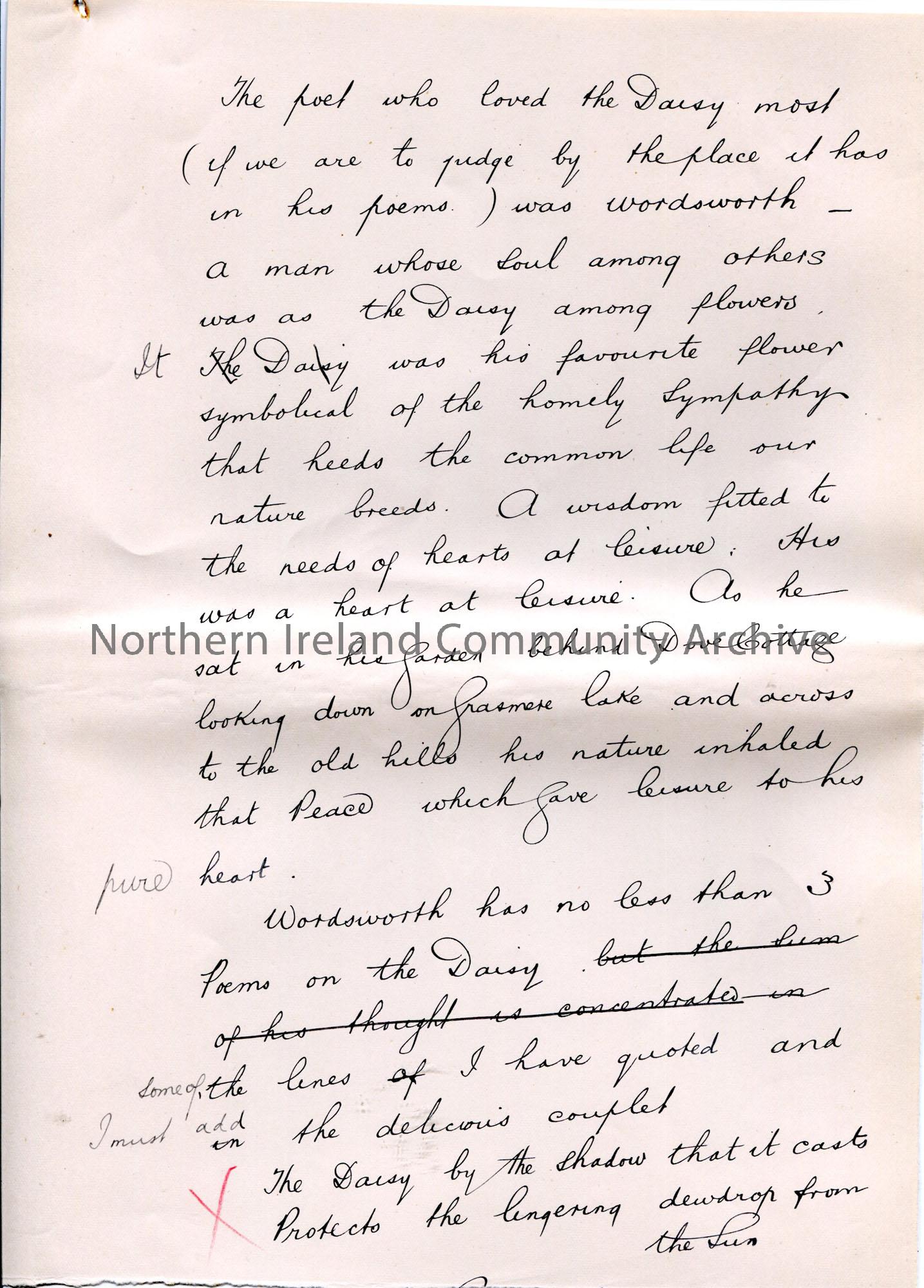Page 17 of 33. Handwritten essay by Sam Henry titled, ‘The Daisy’. Re the flower. Pages not in order.