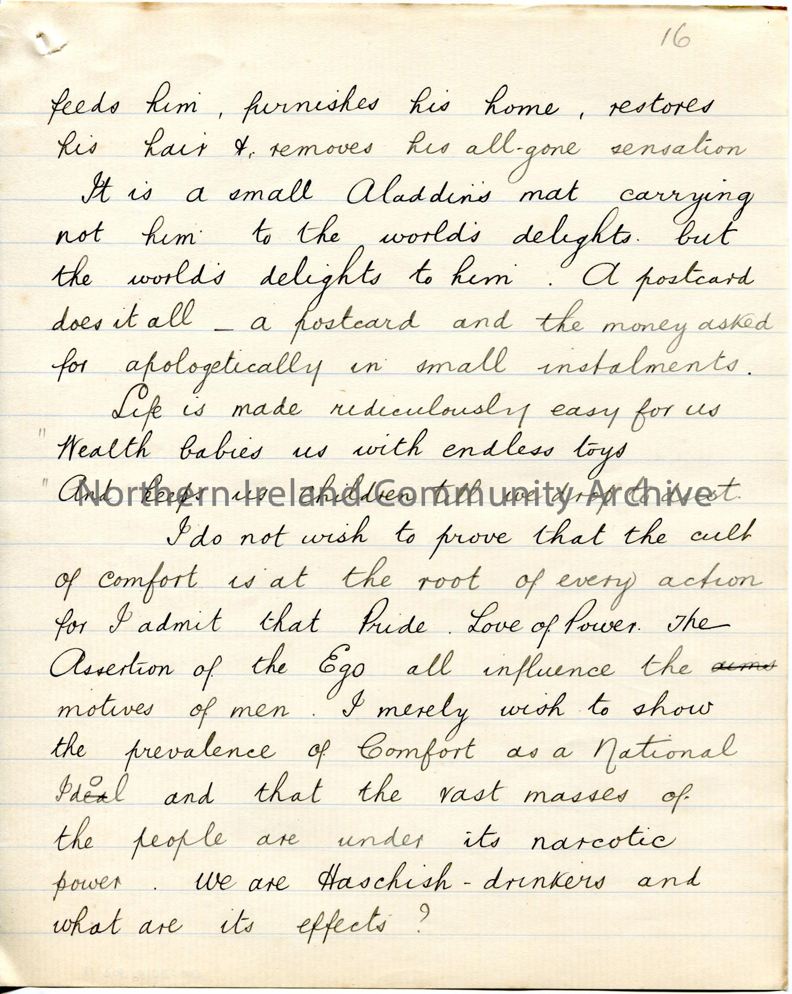 Page 17 of 39. Handwritten essay by Sam Henry titled, ‘The Cult of Comfort’. Title is scored out. Dated Omagh, December 1905. Religious, philosophical…