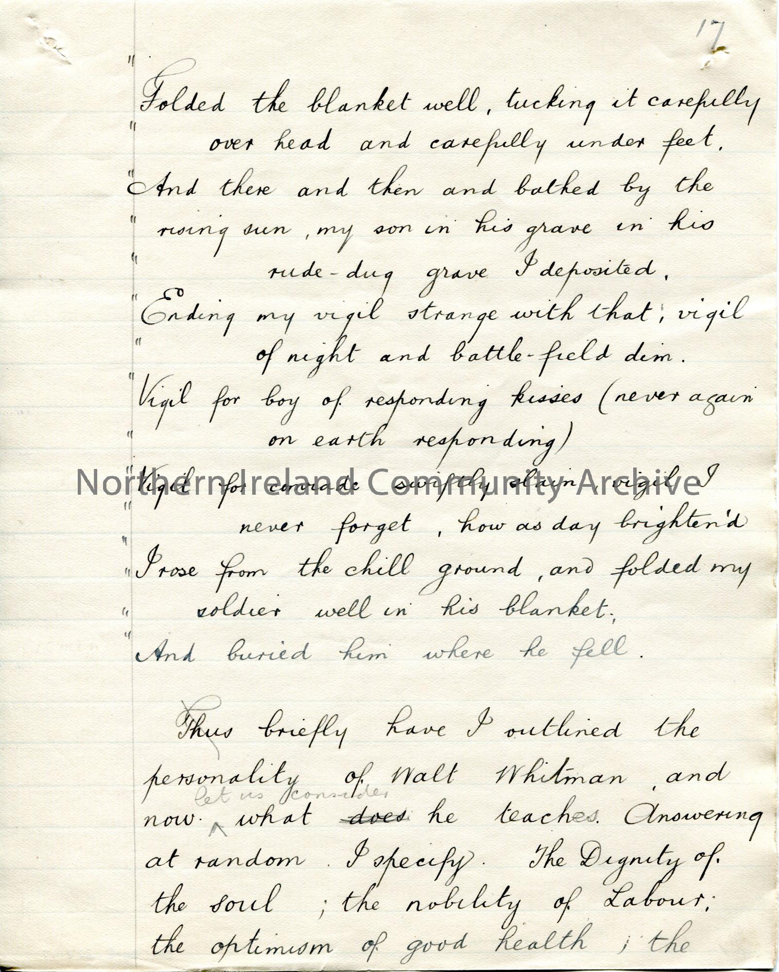 Page 17 of 43. Handwritten essay by Sam Henry titled, ‘Walt Whitman. The Bard of Personality’. Short biography of Whitman and discussion of his poetry…