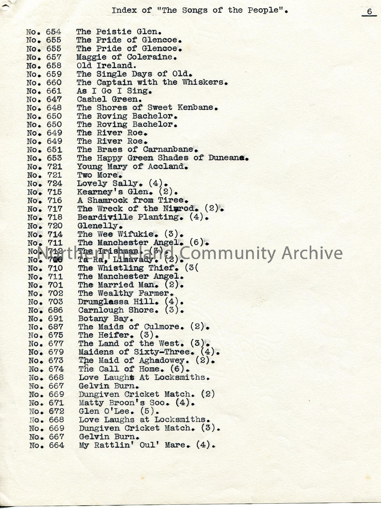 Page 18 of 19. Typed list of song numbers and song names titled, 'Index of "Songs of the People"'. Page 6.