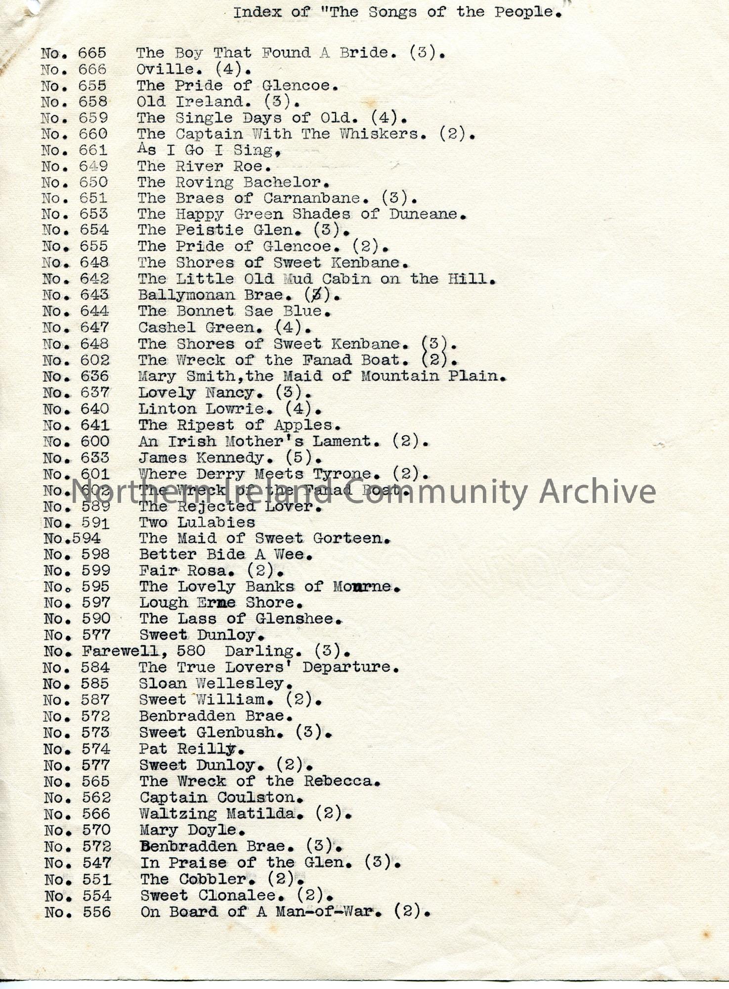 Page 18 of 19. Typed list of song numbers and song names titled, ‘Index of “Songs of the People”‘.