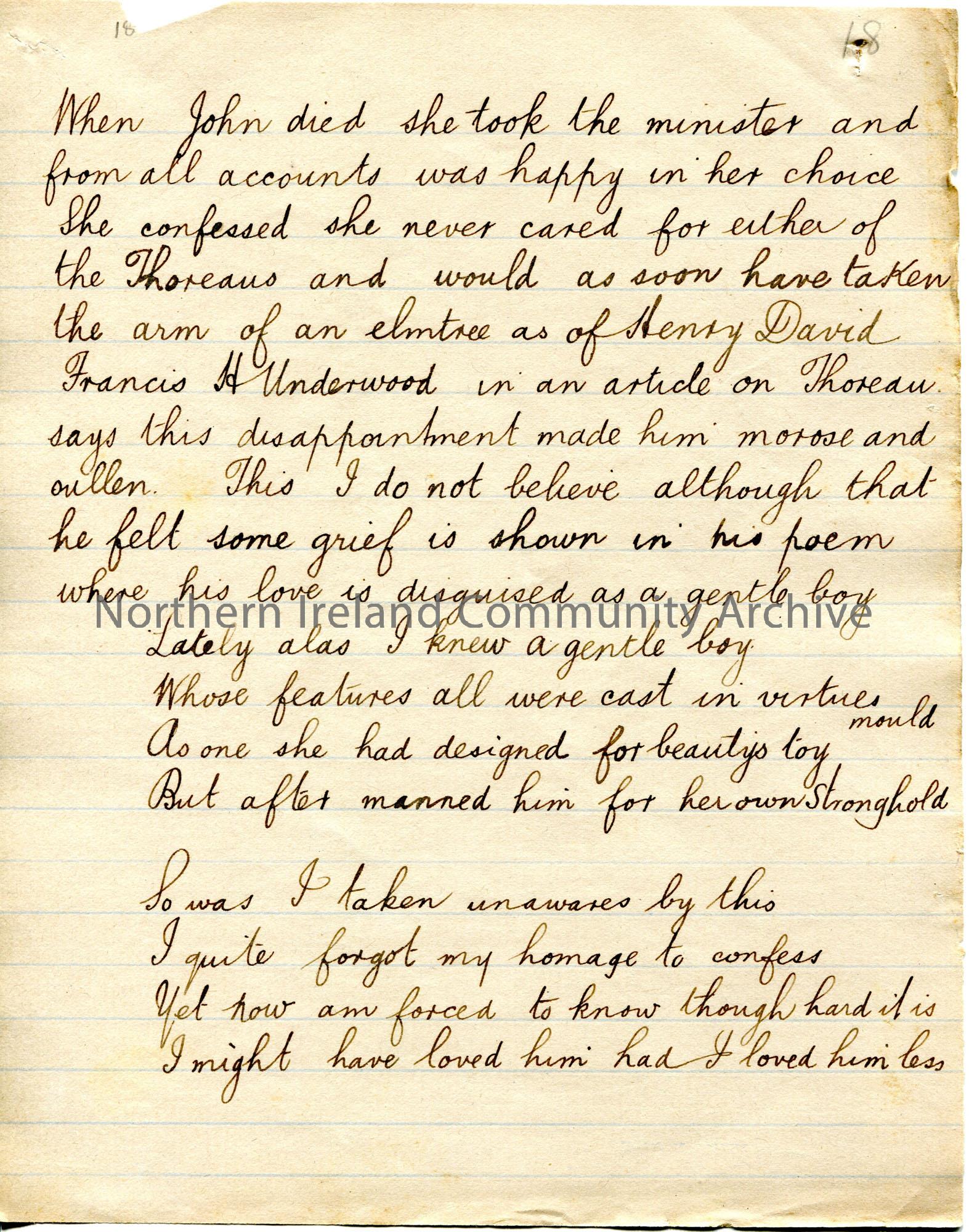 Page 18 of 38. Handwritten essay by Sam Henry titled, ‘The Hermit of Walden’. Philosophical essay re Henry David Thoreau. Sam presents this essay to t…