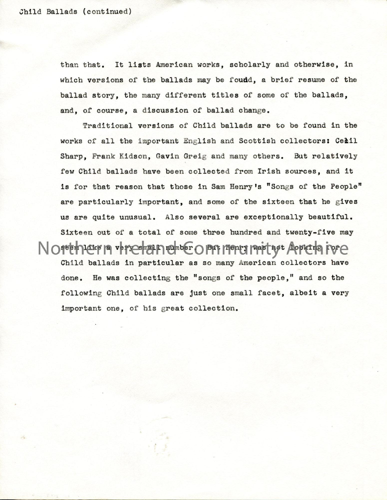 Page 19 of 28. Typed manuscript for Sam Henry's Songs of the People edited by Gale Huntington. Annotated in black ink. Includes the introduction, text re Child Ballads, Laws Ballads, Other Ballads, Songs and Ballad-Like Songs, Chanteys, Lullabys and Signing Games, Bibliography and Index.