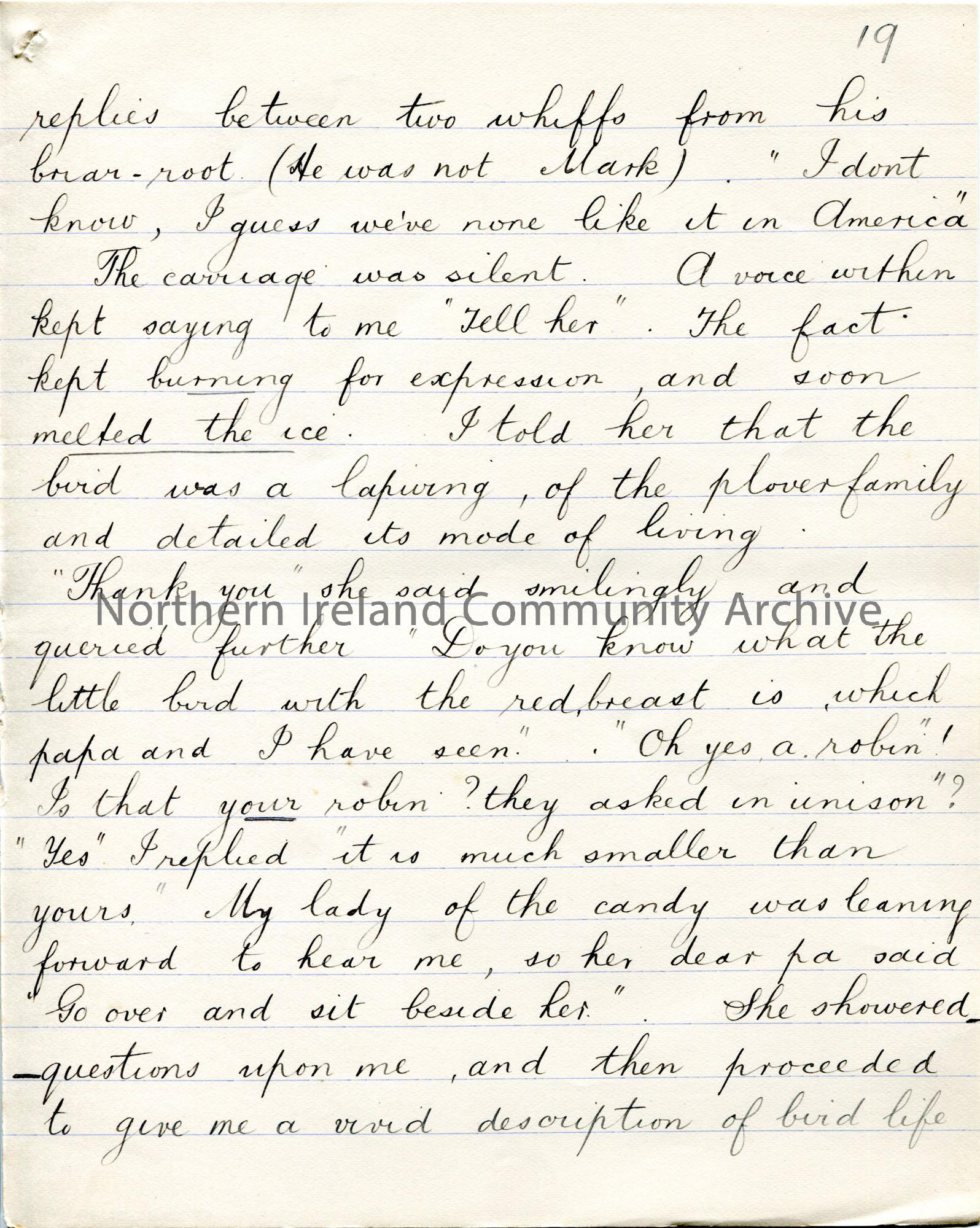 Page 19 of 38. Handwritten essay by Sam Henry titled, 'The Voice from the Ground'. 'Essay - Handshake' written in pencil above title. Re comradeship and Sam's encounters with various people. Contains rough notes on back of some pages of responses to the essay.