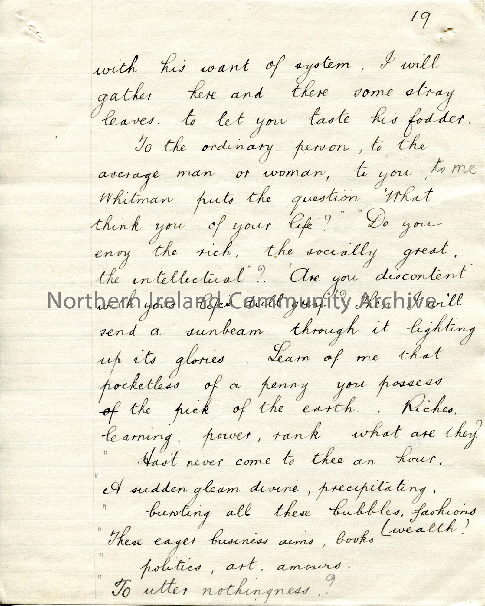 Page 19 of 43. Handwritten essay by Sam Henry titled, ‘Walt Whitman. The Bard of Personality’. Short biography of Whitman and discussion of his poetry…