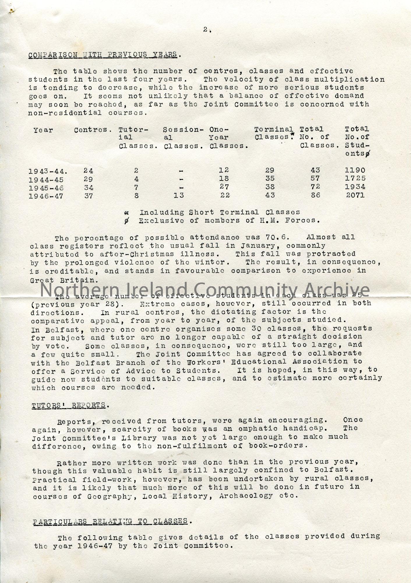 Page 2 of 10. Typed Draft of Sixteenth Annual Report, 1947 for Queen's University of Belfast Joint Committee For Adult Education.
