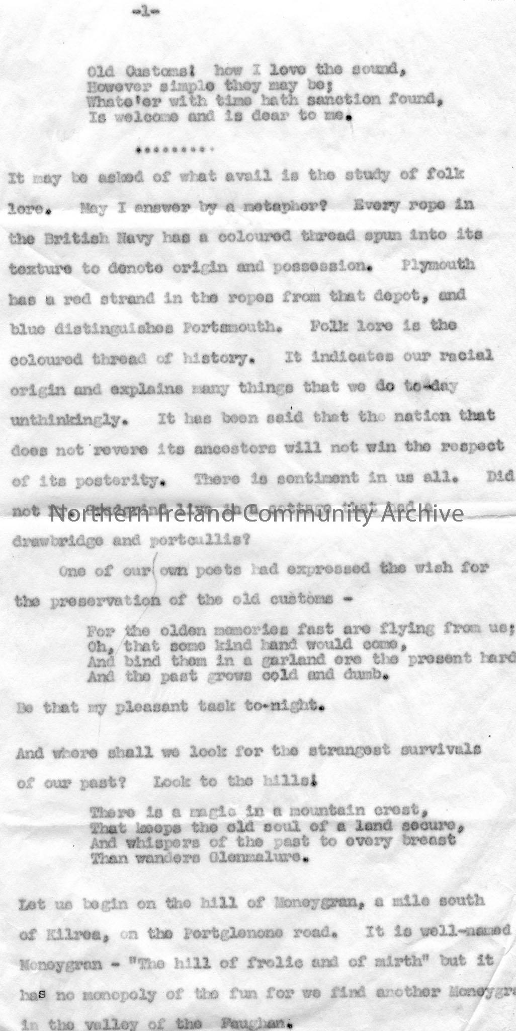 Page 2 of 10. Typed talk for broadcast. Titled, ''Ulster Customs' Midsummer by Sam Henry. Wednesday, May 11th, 6.00-6.15p.m. Page 9 is missing. Talk re customs and traditions of fire and flowers. Midsummer Festival held on St. John's Eve on 23rd June with stories re Moneygran near Kilrea. Refers to the McGrath family name. Writes of Beagh near Maghera and its custom re flowers, fern seeds and invisibility. Also writes of the customs surrounding fish and refers to the Merchant Tailors Company and Salmon Leap, Coleraine.