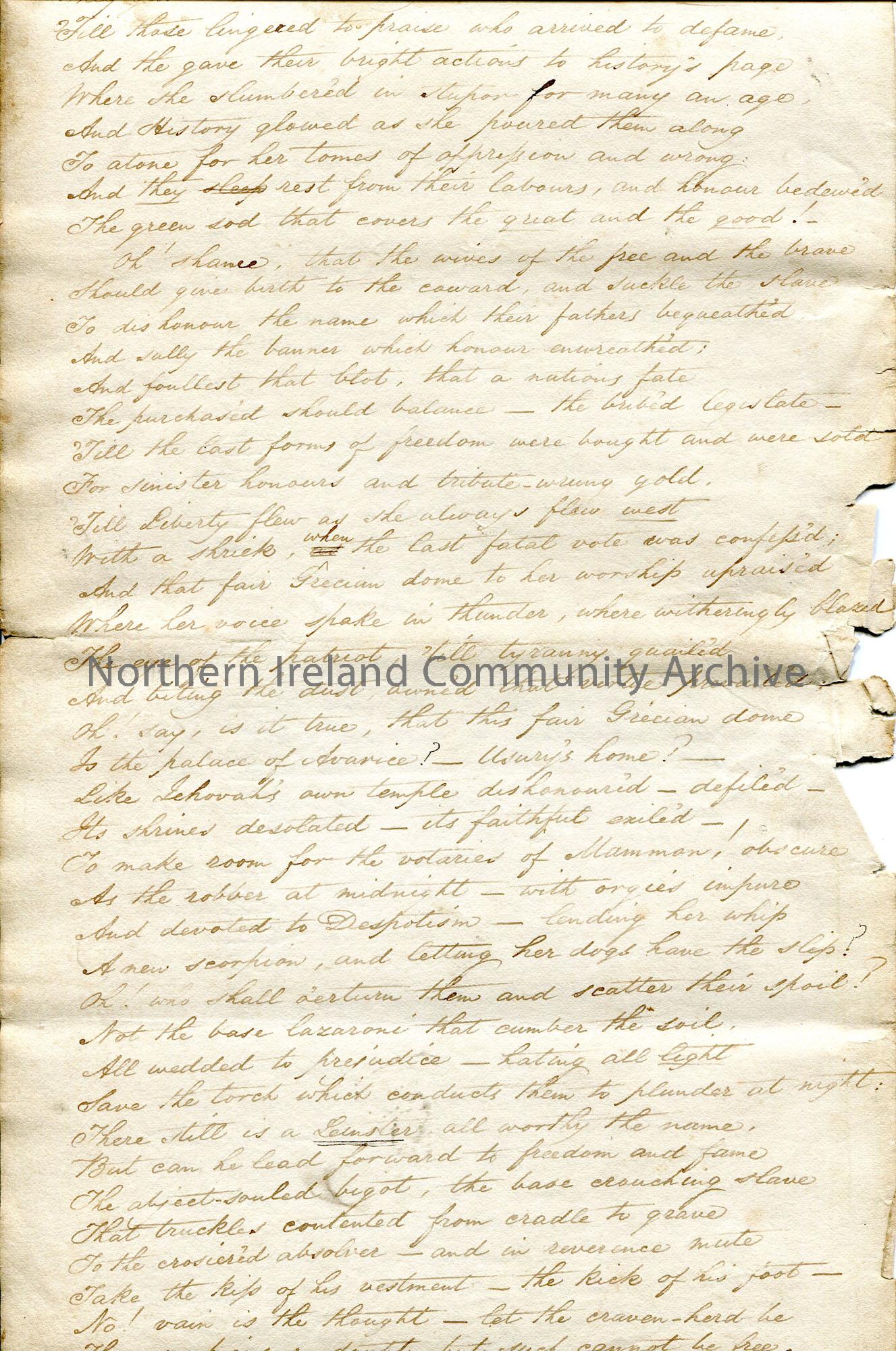 Page 2 of 12. Handwritten verses of poetry. Some of which are untitled. Titled pieces - 'The Emigration', 'L'Amour' Translated from the French 1814, 'The Shift' 1812, 'The Stranger-Hound. A Dunmull Legend' 1812, 'Impromptu, On my Birthday' 21st December 1809, 'To My Flute' 1807, 'Prologue to Speed the Plough' 1806 and 'Occasional Address. Spoken at the opening of the private theatre, Colerain' 1806.