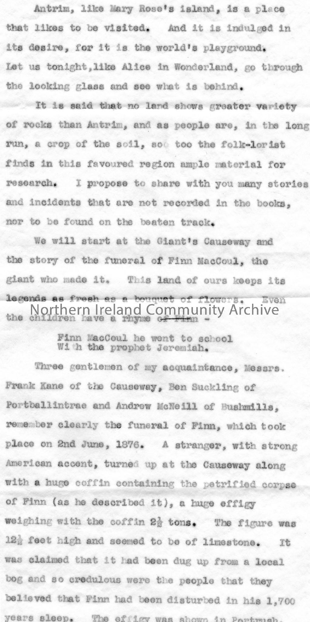 Page 2 of 12. Typed script for broadcast, rough copy, titled, ‘Undiscovered Ulster. Co. Antrim by Sam Henry. Thursday, 27th October, 9.20 – 9.40p.m.’ …