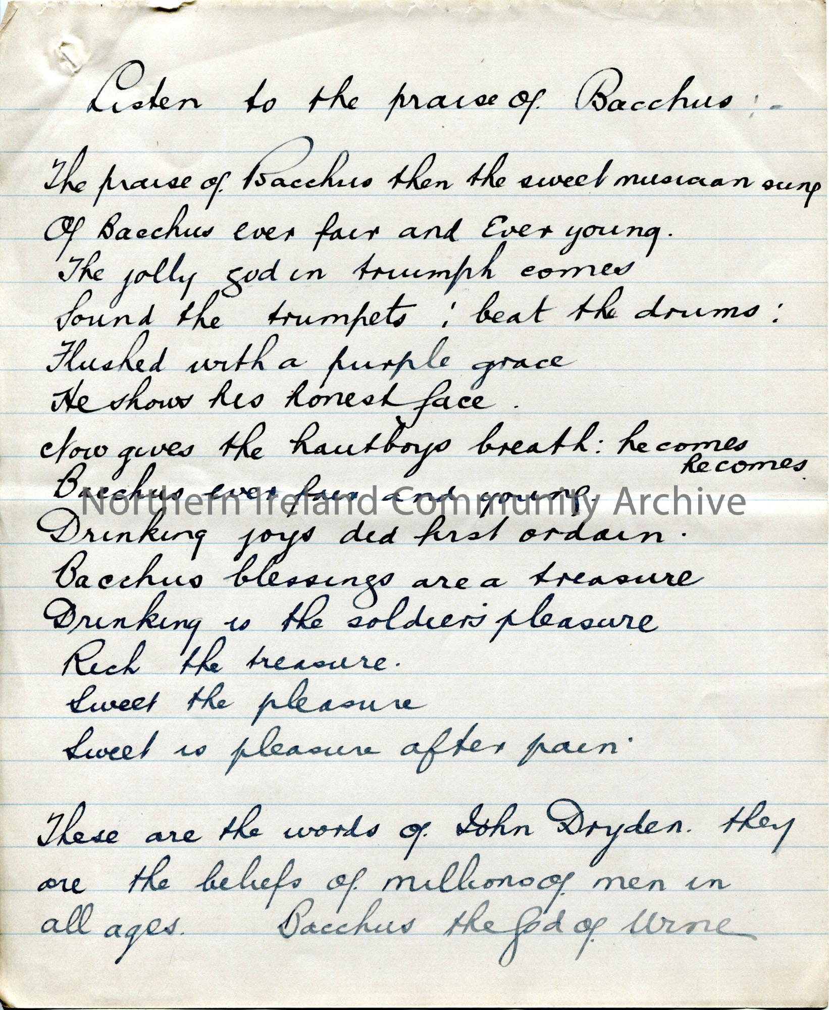 Page 2 of 15. Handwritten essay titled, ‘The Challenge of Bacchius’. Based on the poem ‘The Challenge of Thor’ by Henry Wadsworth Longfellow.