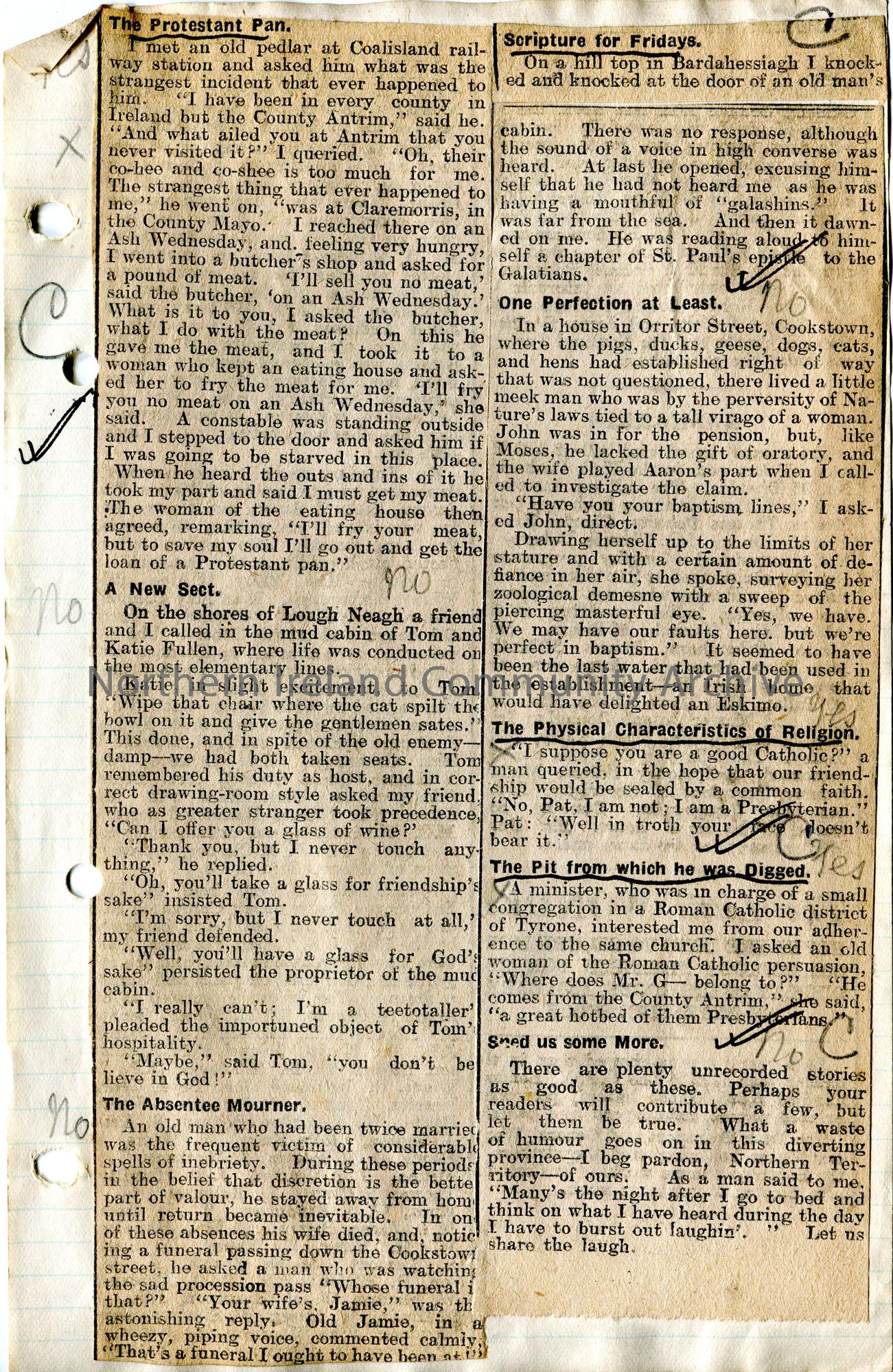Page 2 of 2. Article cut from a newspaper and pasted to page. Titled, ‘ Parochial Stories. Wit and Wisdom of the Six Counties’ by Sam Henry. Marked wi…