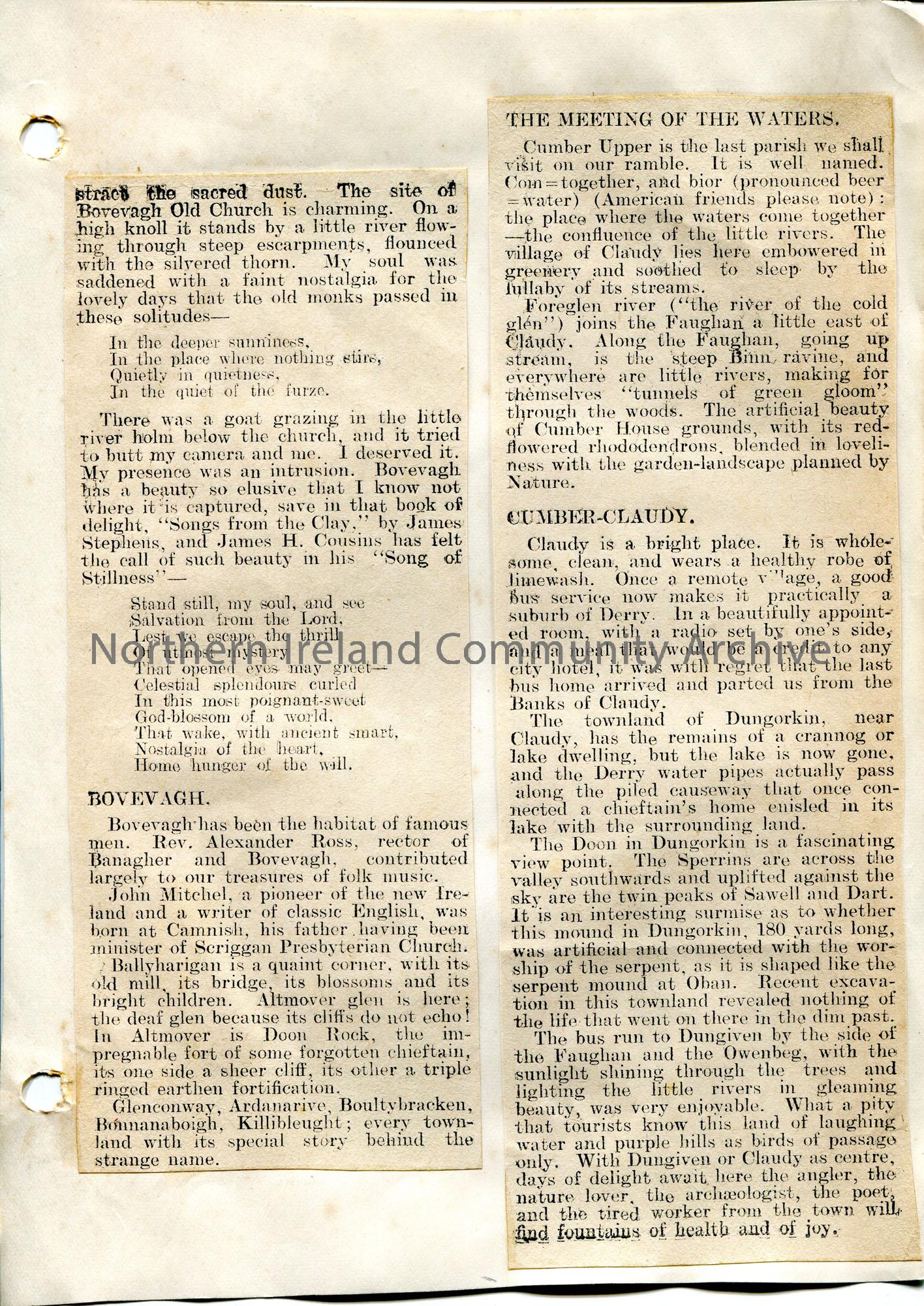 Page 2 of 2. Article cut from newspaper and pasted to page. No title. Re Dungiven. Refers to the banshee of the O'Cahans, Grania Roe; the witch Maeve of Bovevagh; Bovevagh Old Church and Claudy.