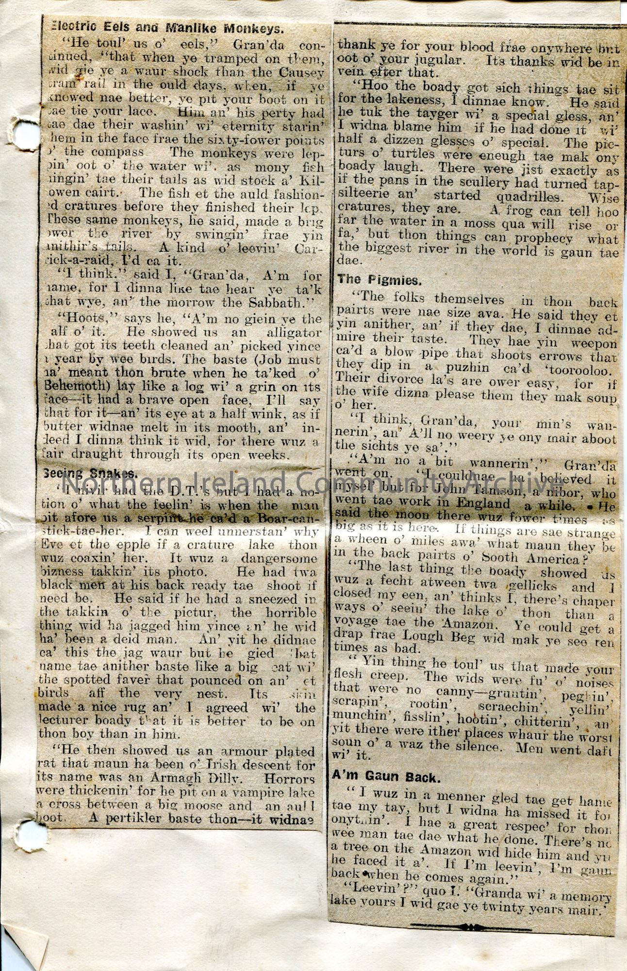 Page 2 of 2. Article cut from newspaper and pasted to page. Titled, 'Gran'da And The Amazon. A Voyage on a Tip-Up State'. Related by Auld Farrant. Written in local dialect - Ulster Scots?