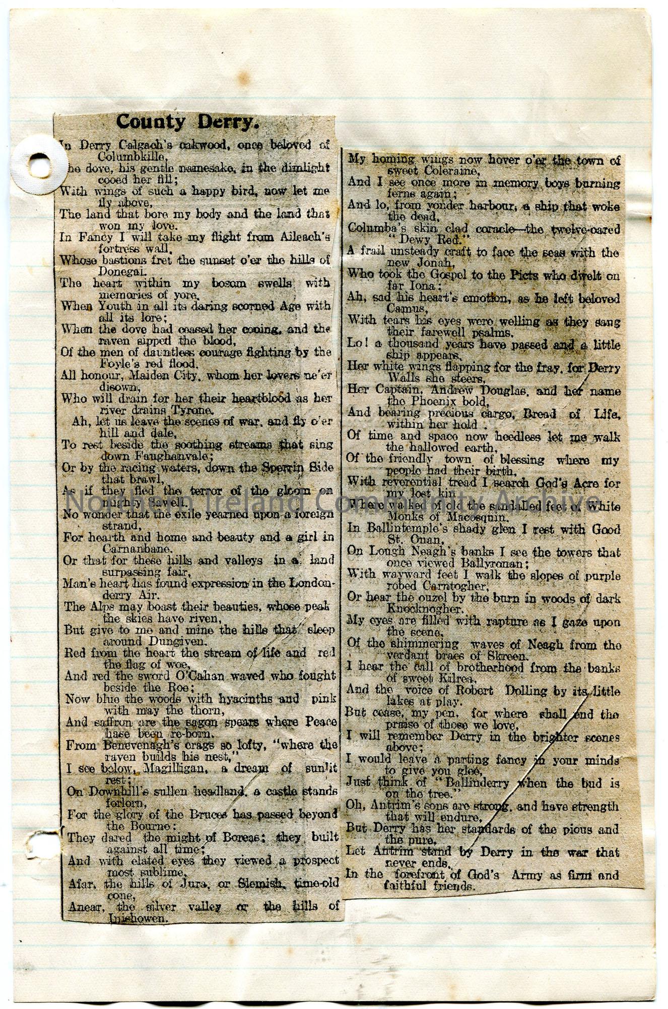 Page 2 of 2. Article cut from newspaper and stuck to lined paper titled, ‘Northern Place Names. By “Sam, the Rhymer”‘. Re County Antrim and County Der…