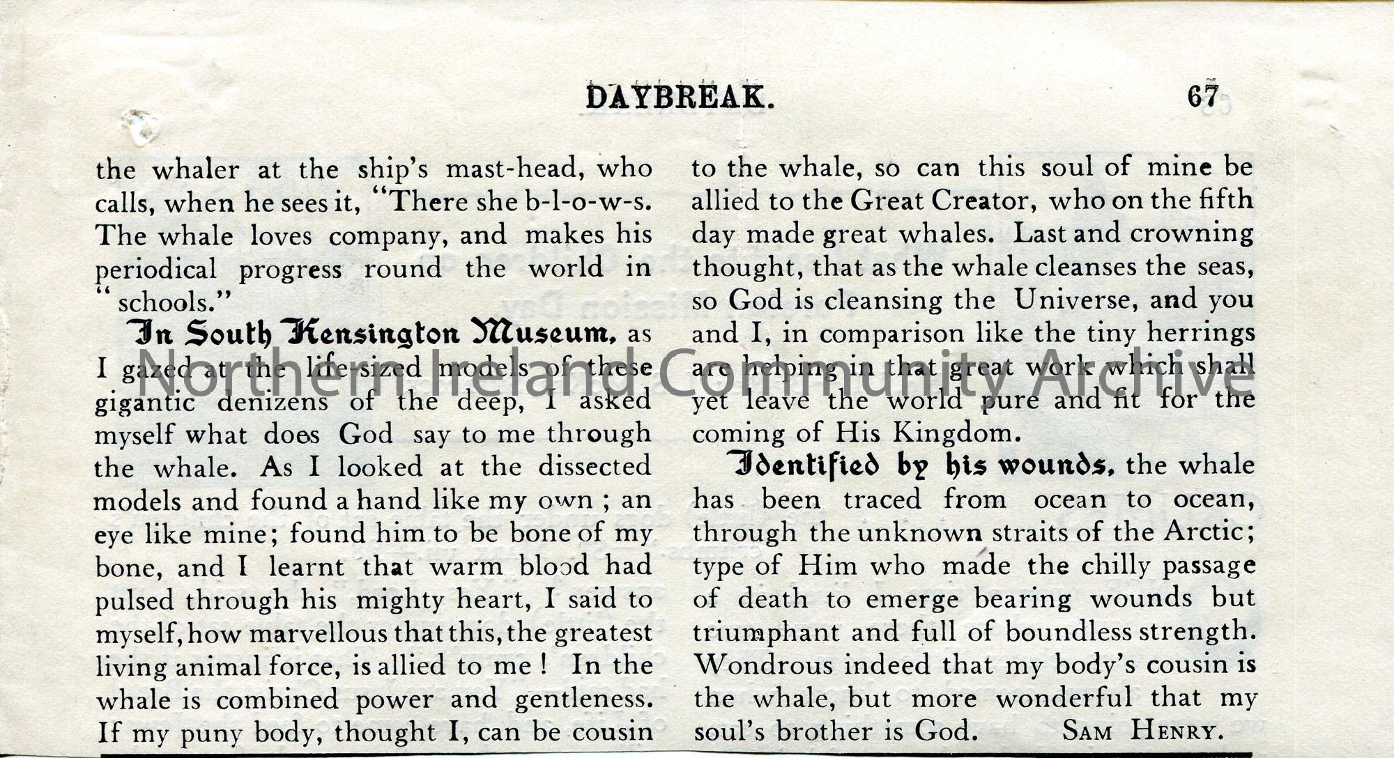 Page 2 of 2. Article from publication ‘Daybreak’ by Sam Henry titled, ‘Cousin Moby – The Whale’.