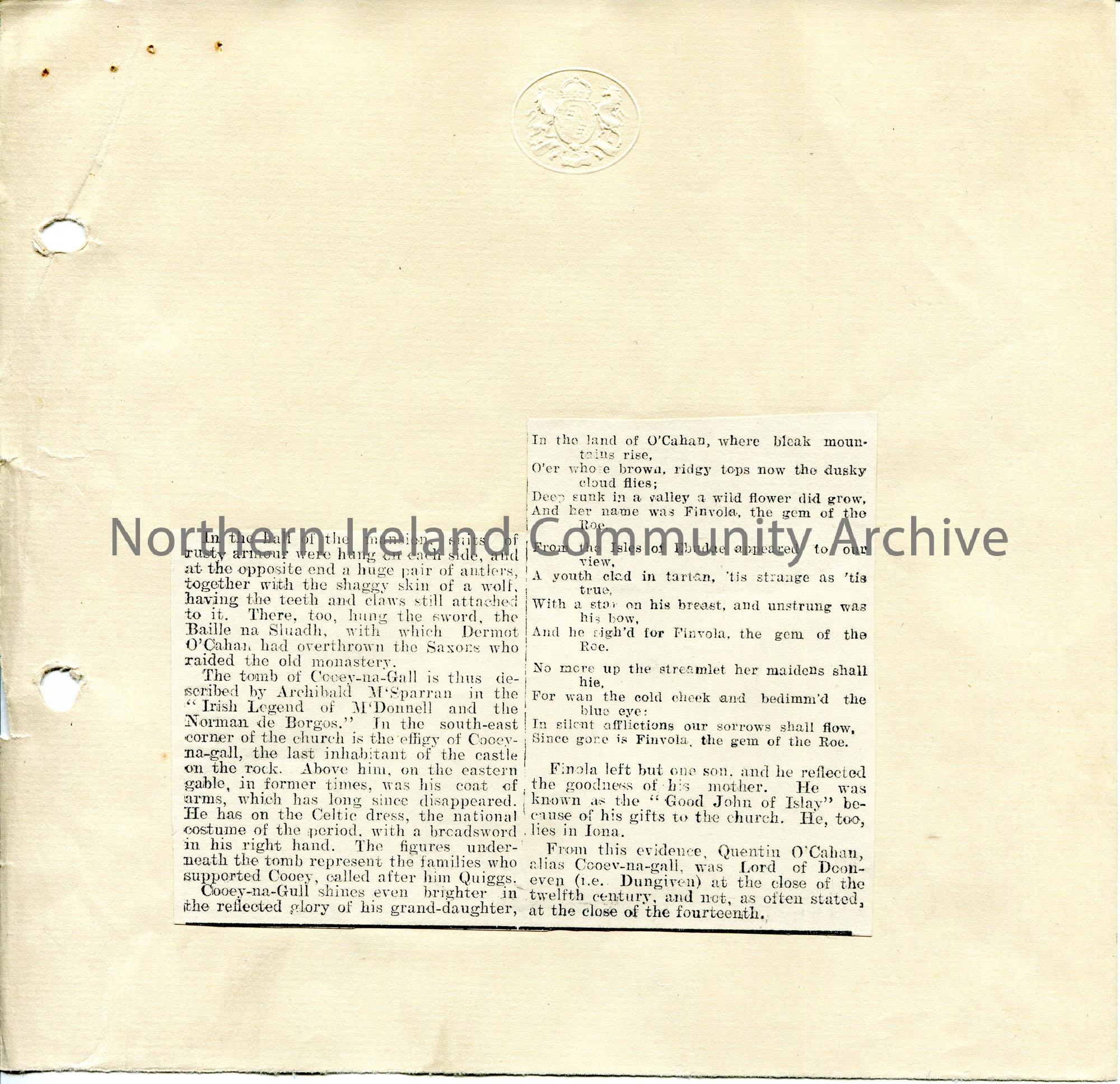 Page 2 of 2. Copy of an article with photographic image titled, 'No. 22. - Cooey-Na-Gall's Tomb, Dungiven Priory Church'. Photograph is of the tomb itself. Re Cooey-na-Gall - warrior and one of twelve sons on Dermot O'Cahan - and Finvola / Finola 'Gem of the Roe'.