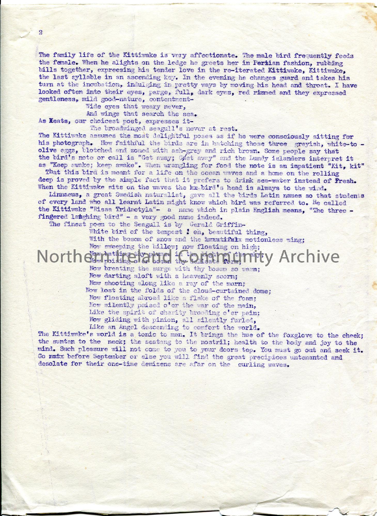 Page 2 of 2. Copy of typed article titled, ‘The Kittiwake Gull’ by Sam Henry. Sam describes a time on Rathlin island observing Kittiwakes. At one poin…