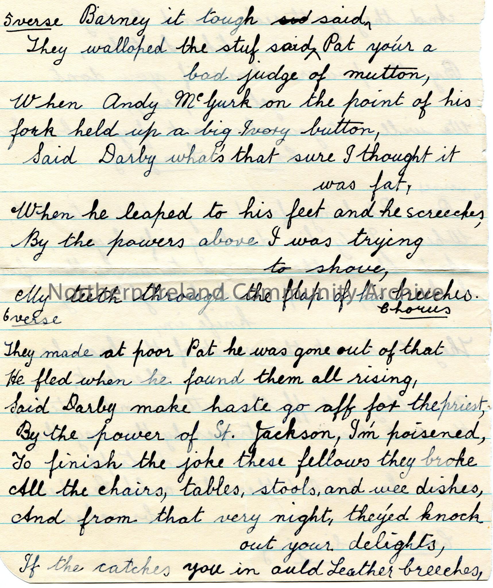Page 2 of 2, double sided, of handwritten humorous song. Six verses. Titled, ‘The Auld Leather Breeches’. From James Bond, Termaquin, Limavady. Dated … – scan050d