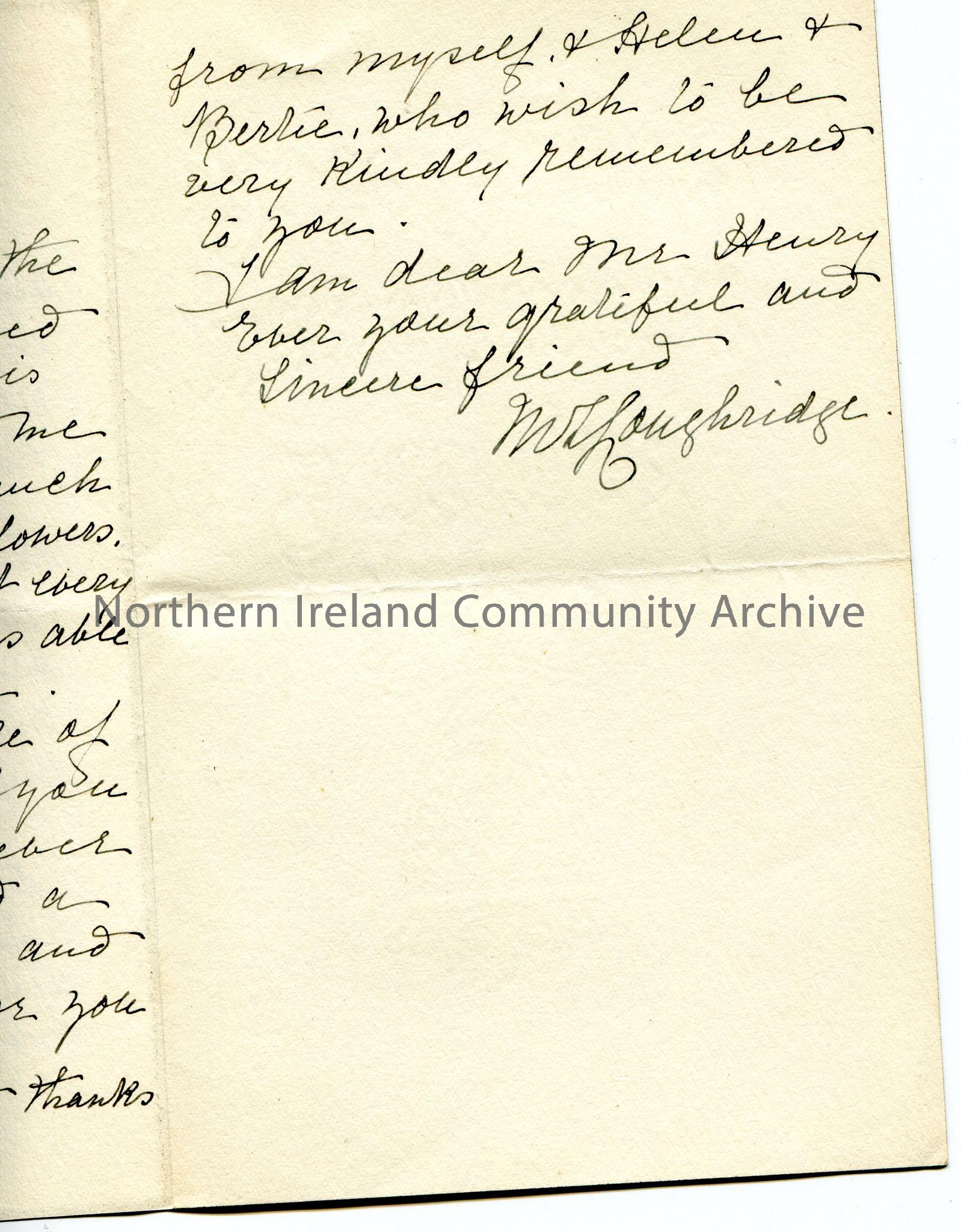 Page 2 of 2. Handwritten letter (black border for mourning, pages folded over) to Sam Henry. Letter of praise and thanks. Thanks Sam for his present w… – scan142g