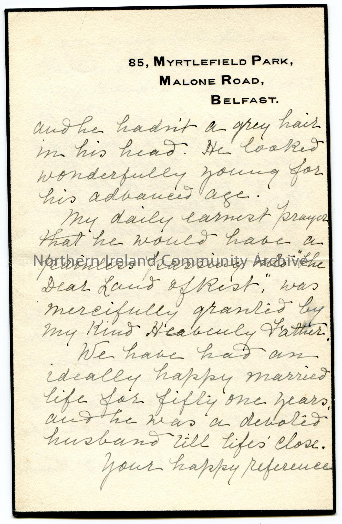 Page 2 of 2. Handwritten letter (black border for mourning, pages folded over) to Sam Henry. Letter of praise and thanks. Thanks Sam for his present which she values highly. Praises his poetry. She has sent a photograph of Sam's as well as verses to Canada, USA, Australia and Egypt. Recounts her husband's passing at their home. Writes how much her husband admired Sam. She is left with her son Bertie and daughter Helen.