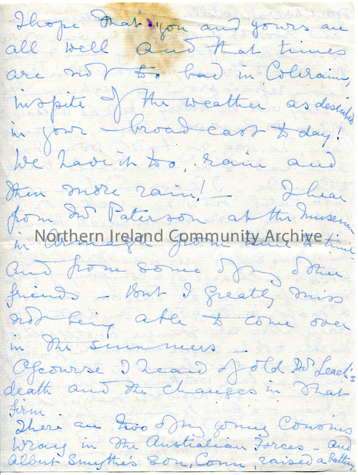 Page 2 of 2. Handwritten letter (double sided) presumably to Sam Henry. [First and last pages are missing]. Writes that they have written a book, yet to be published titled, 'The Wrays of Donegal of Londonderry and Antrim'. Notes that two of her cousins are in the Australian Forces; Albert Smyth's son Conn raised an anti-aircraft artillery in Canada and went to France; two of her niece's work in the WRNS [Women's Royal Naval Service] and ATS [Auxiliary Territorial Service].
