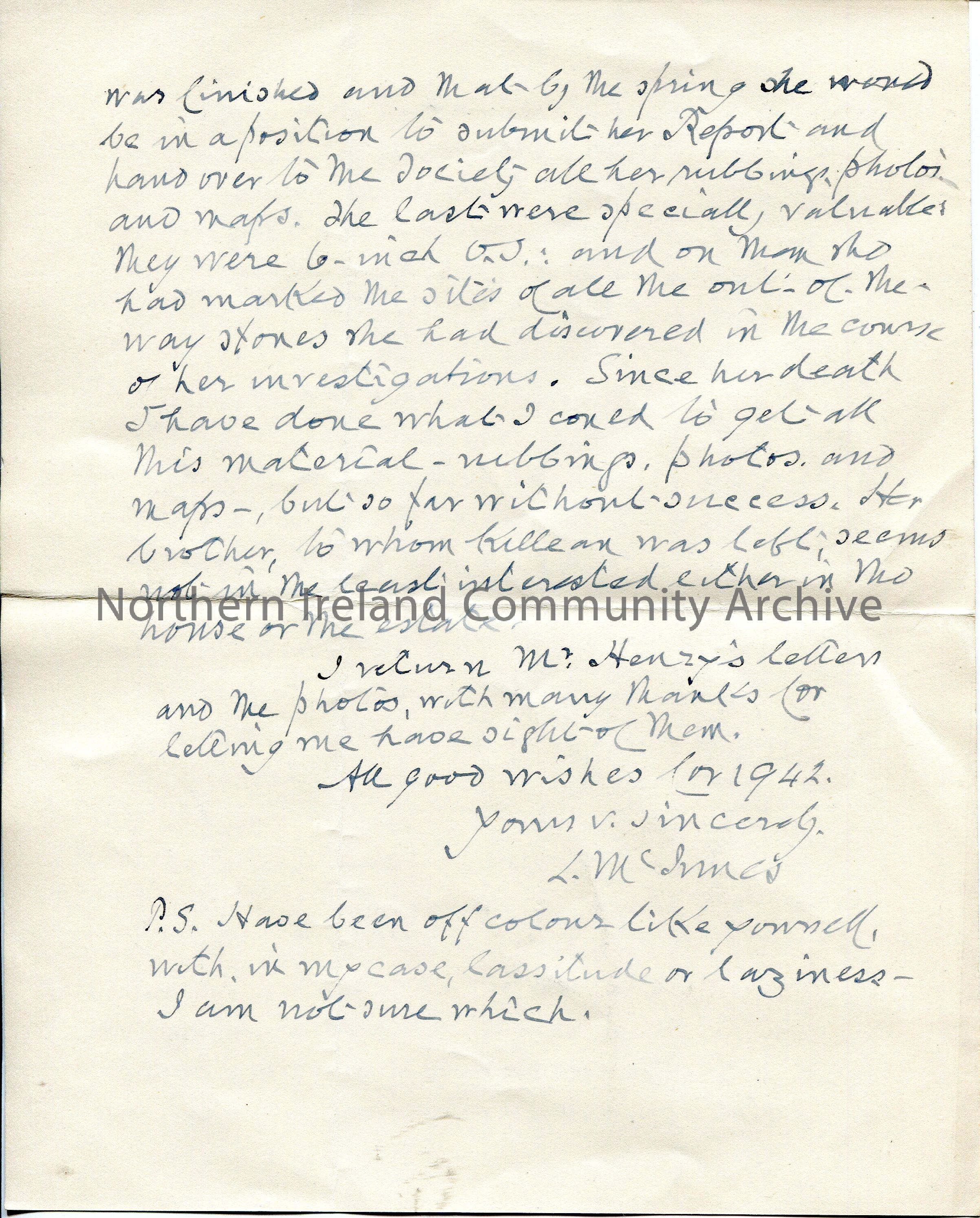 Page 2 of 2. Handwritten letter (double sided) to Archie. Re the meaning of cup-markings. Mentions Sam Henry who was researching this topic. Sam has written a story re the cross at na Naghan to appear in the Irish Times. Returns Sam's letter and photos.