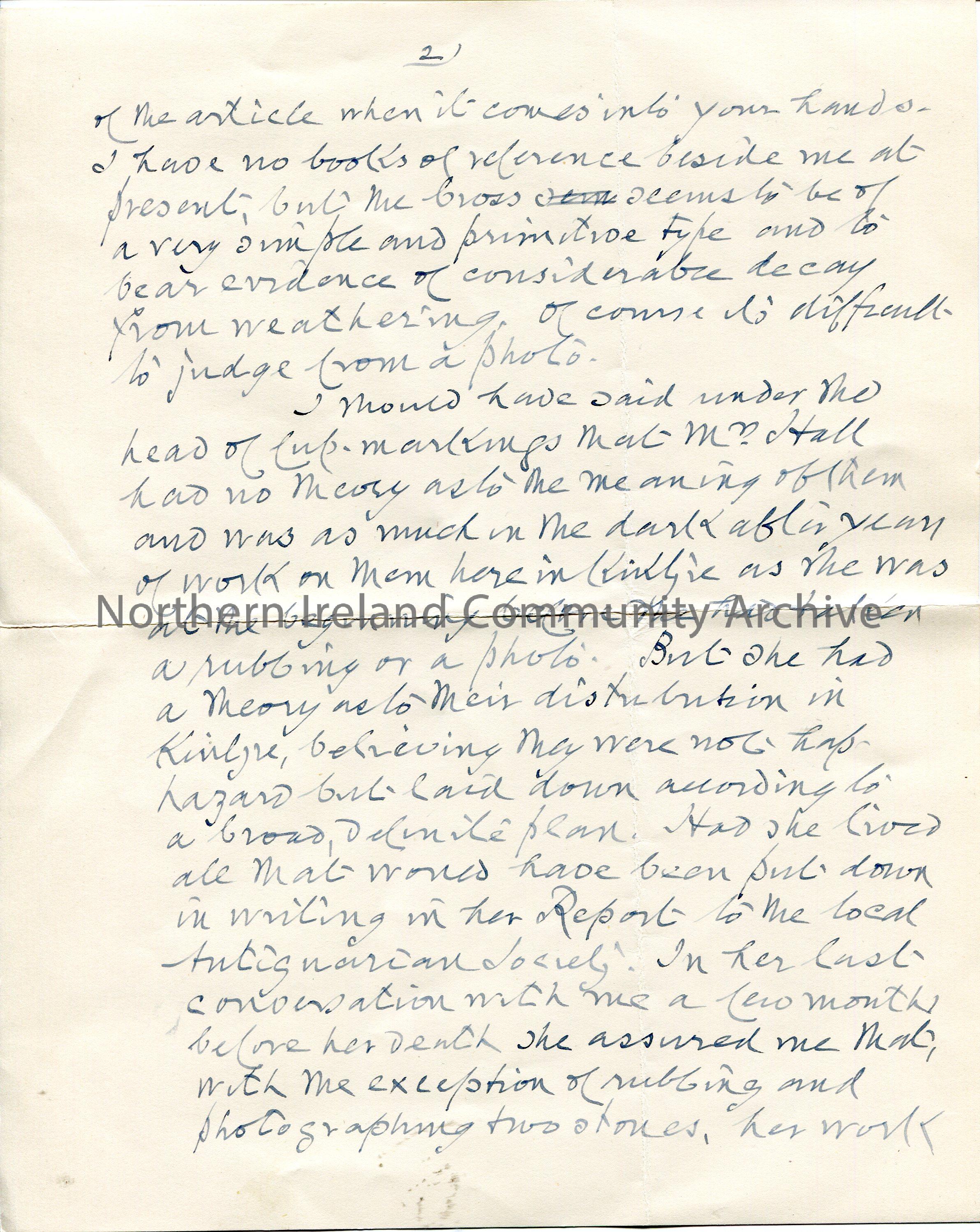 Page 2 of 2. Handwritten letter (double sided) to Archie. Re the meaning of cup-markings. Mentions Sam Henry who was researching this topic. Sam has written a story re the cross at na Naghan to appear in the Irish Times. Returns Sam's letter and photos.