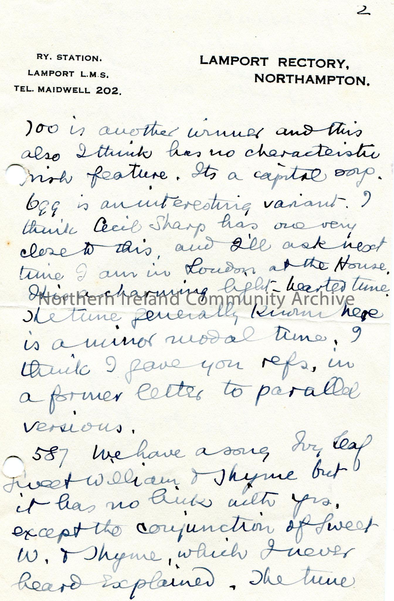 Page 2 of 2. Handwritten letter (double sided) to Mr Henry. Discusses songs which Sam has sent by their number and not their title. Refers to numbers 707, 706, 705, 704, 703, 702, 701, 700 and 587. Writes of the tunes and melodies of the songs. Mentions Cecil Sharp.