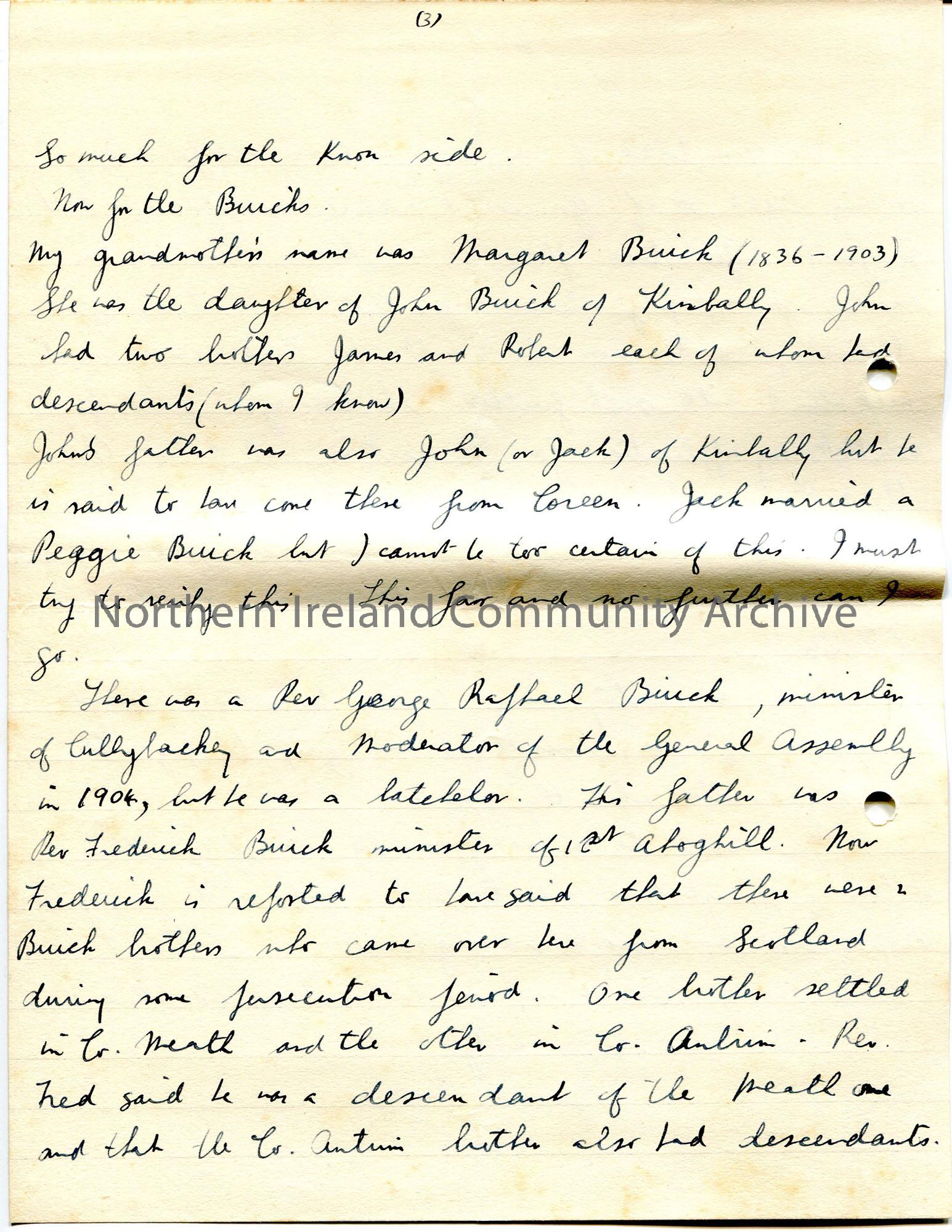 Page 2 of 2. Handwritten letter (double sided) to Mr Henry. Gives details of their ancestry – two sides – Knox and Buick. Also gives answers to Sam’s …