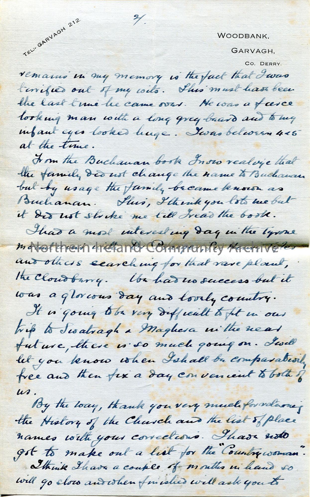 Page 2 of 2. Handwritten letter (double sided) to Sam Henry from R A Macausland. Thanks Sam for sending Campbell article and photographs. Writes of his interest in the Buchanan book; how he believes the Fleur de Lys was added to the Coat of Arms; re his Uncle Oliver; recounts a day in the Tyrone mountains looking for rare plants with Dr Praeger and Sir Henry Tyler; hopes to meet up with Sam on a trip of Swatragh and Maghera.