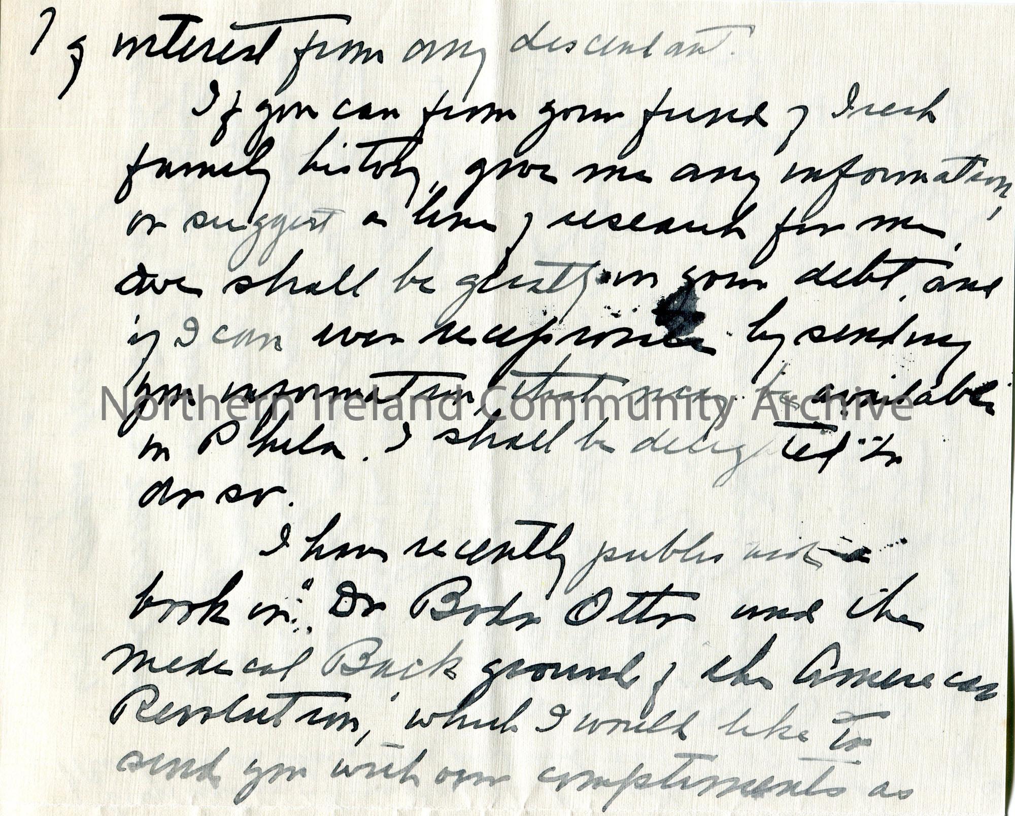 Page 2 of 2. Handwritten letter (folded and written on 4 sides) to Sam Henry from James E Gibson. Believes they have ancestral links in Buncrana, Co. … – scan009g
