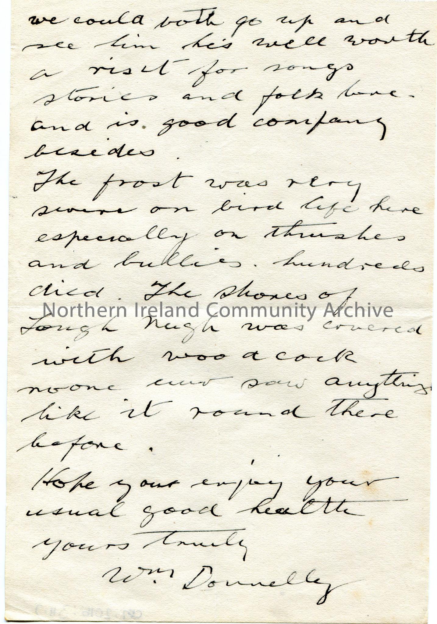 Page 2 of 2. Handwritten letter from Wm. [William] Donnelly to Sam Henry. Apologises for delay in sending songs.Waiting to receive the full song 'The White Hare' to send on to Sam from [?] Haughey. Talks about the weather.