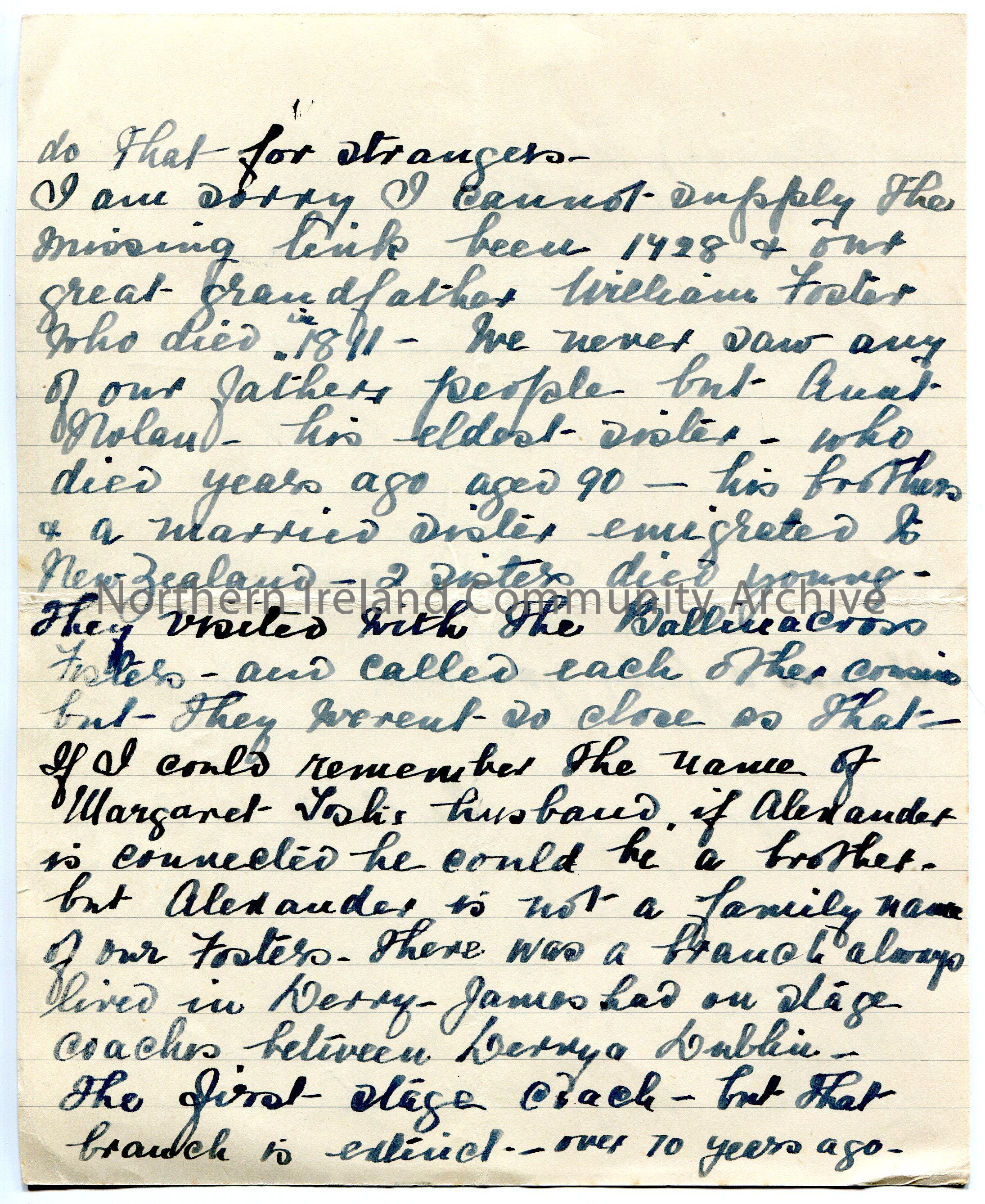 Page 2 of 2. Handwritten letter on lined paper to ‘Dear Sir’. Provides Sam with genealogical information re their family name of Foster. – scan067d