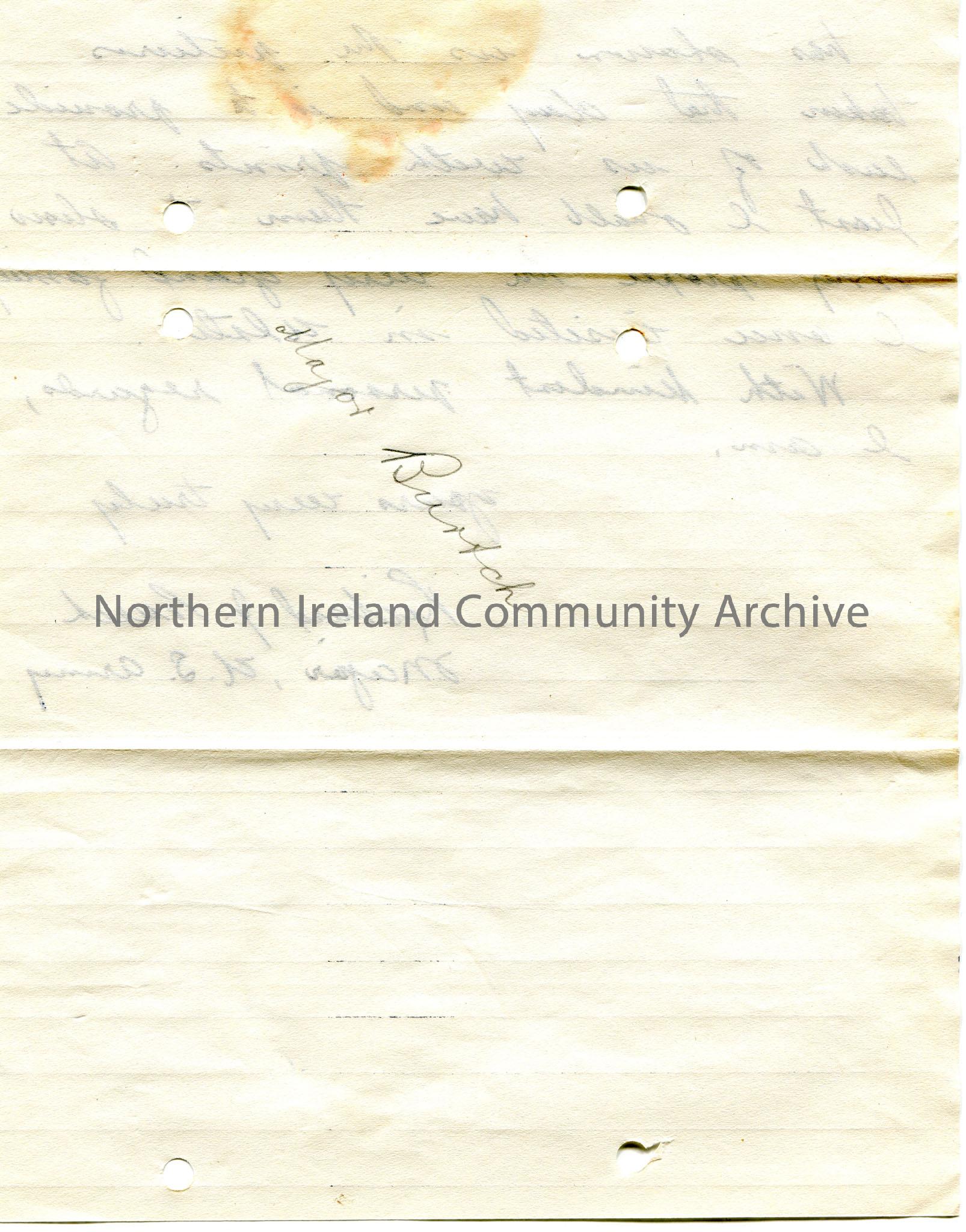 Page 2 of 2. Handwritten letter, on lined paper, to Mr and Mrs Sam Henry and Miss Olive. Extends his thanks for their hospitality during his time in Ulster. Writes that the day spent with them was 'the most enjoyable that I have had in the eleven months here'. He is leaving soon and does not anticipate returning. Mr Martin showed him photographs of the day they spent together and is to get prints of them.