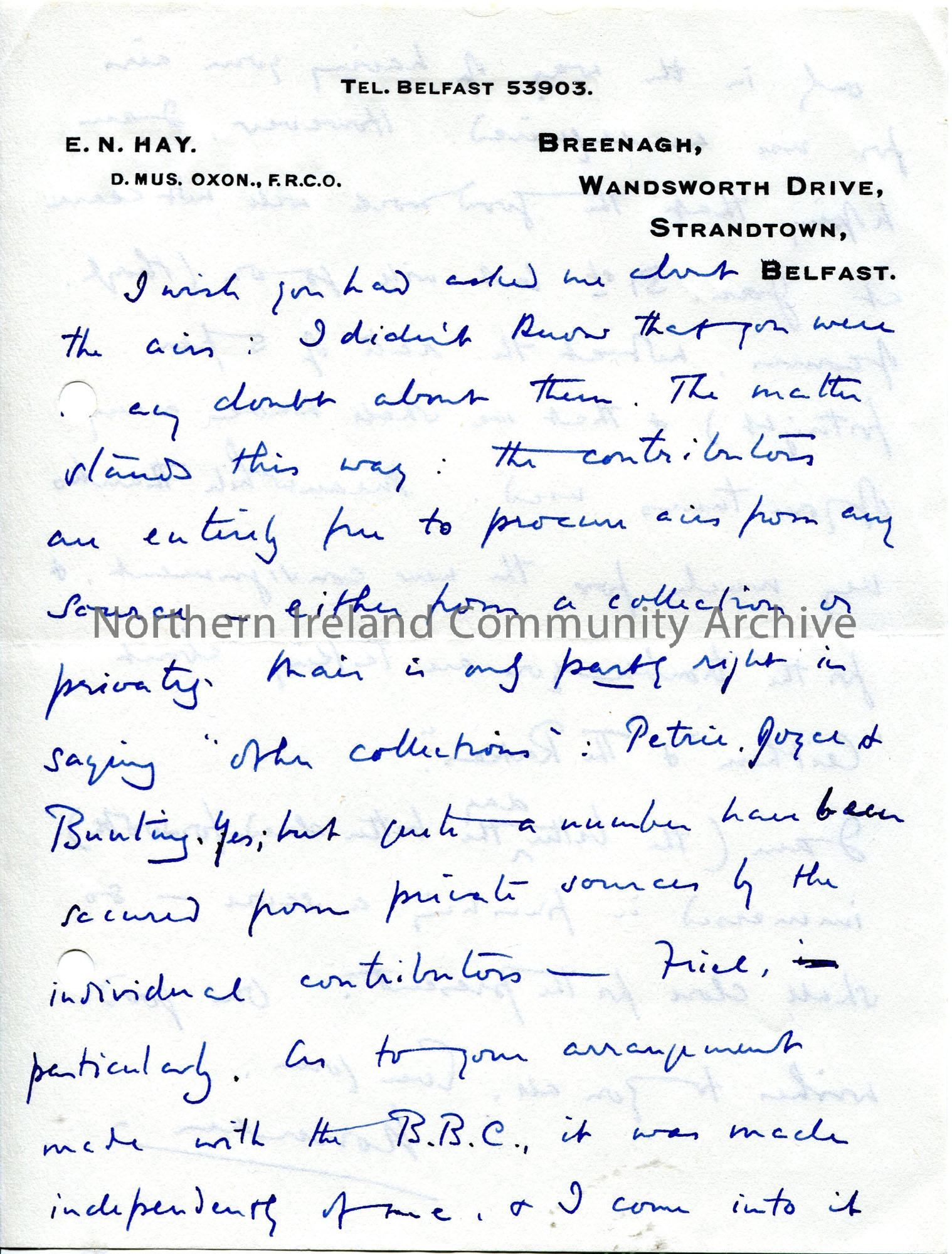 Page 2 of 2. Handwritten letter (pages double sided) to Sam Henry. Writes that he is sorry to hear of the 'break with Bob Bacon' and Sam. Writes of a matter concerning airs and contributors which Sam appears to have doubts over.