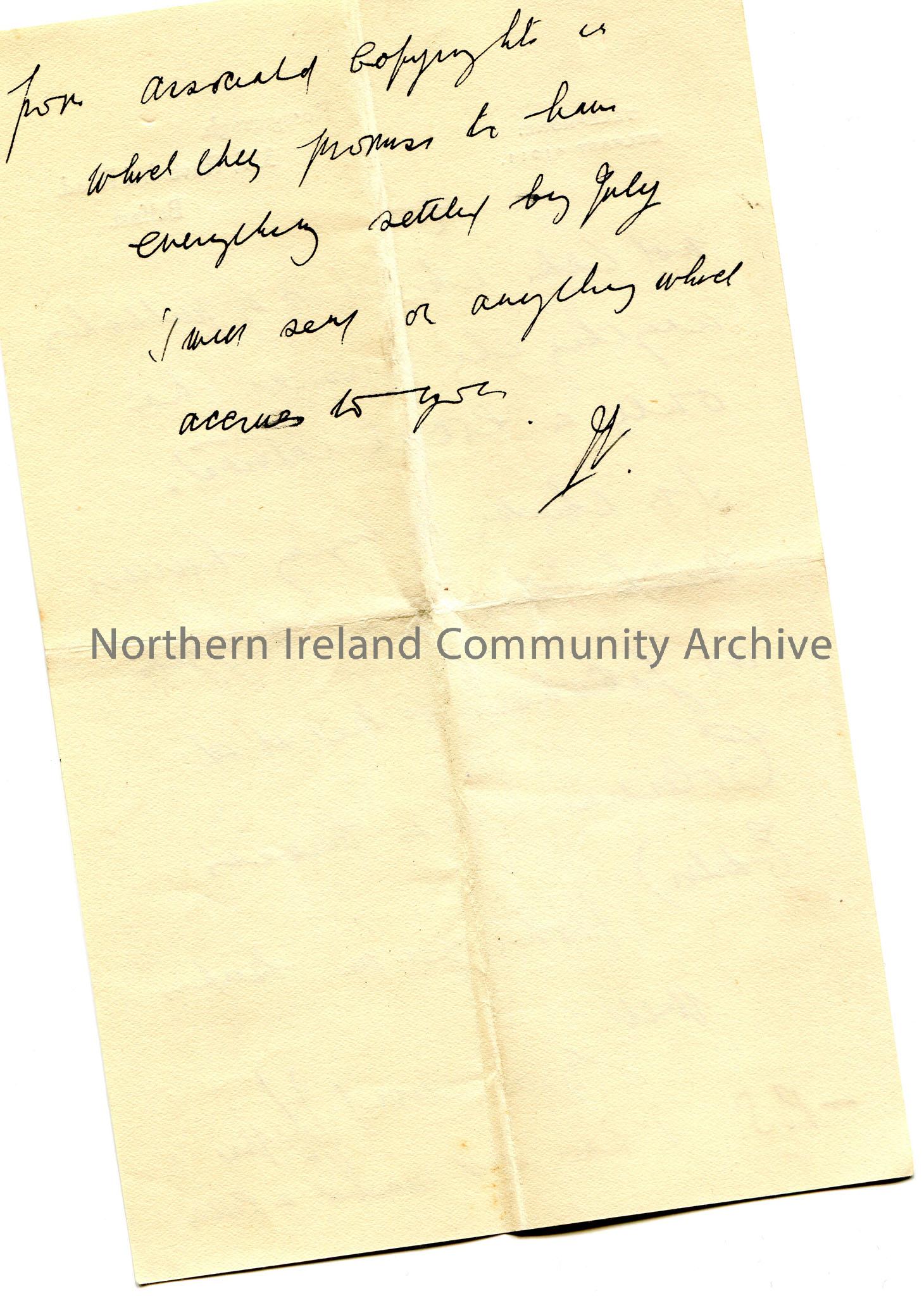Page 2 of 2. Handwritten letter to Mr Henry. Writing re the royalties for songs ‘The Ould Lammas Fair’ and ‘The Black Chimney Sweeper’. Mentions Curwe… – scan098d