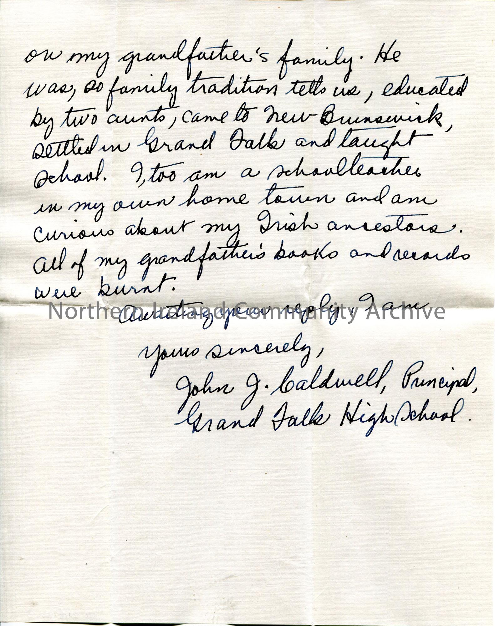 Page 2 of 2. Handwritten letter to Sam Henry. Asks for Sam's help to search for genealogical information re their grandfather Robert Caspar Caldwell who came from County Tyrone and moved to New Brunswick, Grand Falls, Canada.