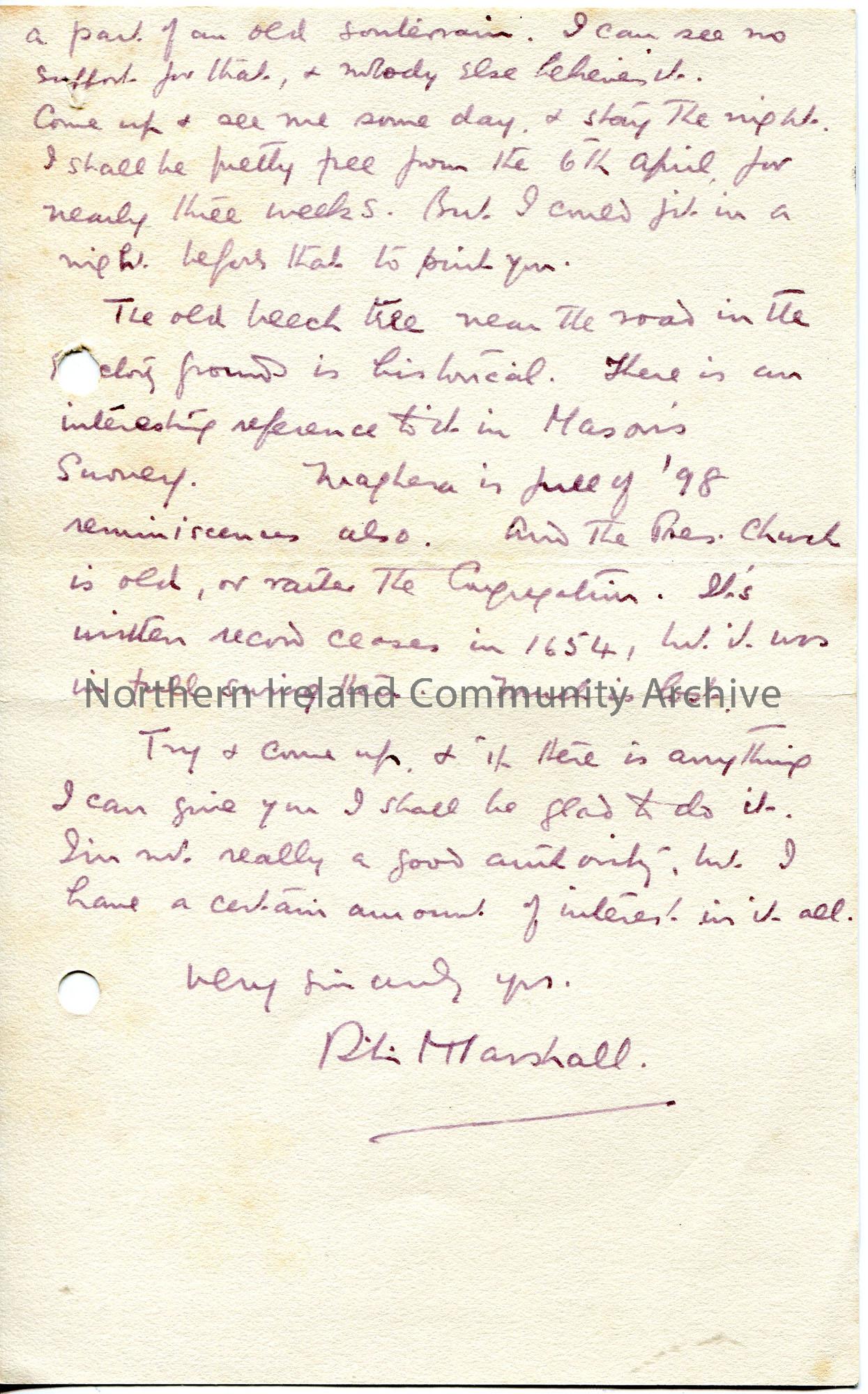 Page 2 of 2. Handwritten letter to Sam Henry. Asks Sam to read notes re Maghera from a book of Kingsley Porter’s.
