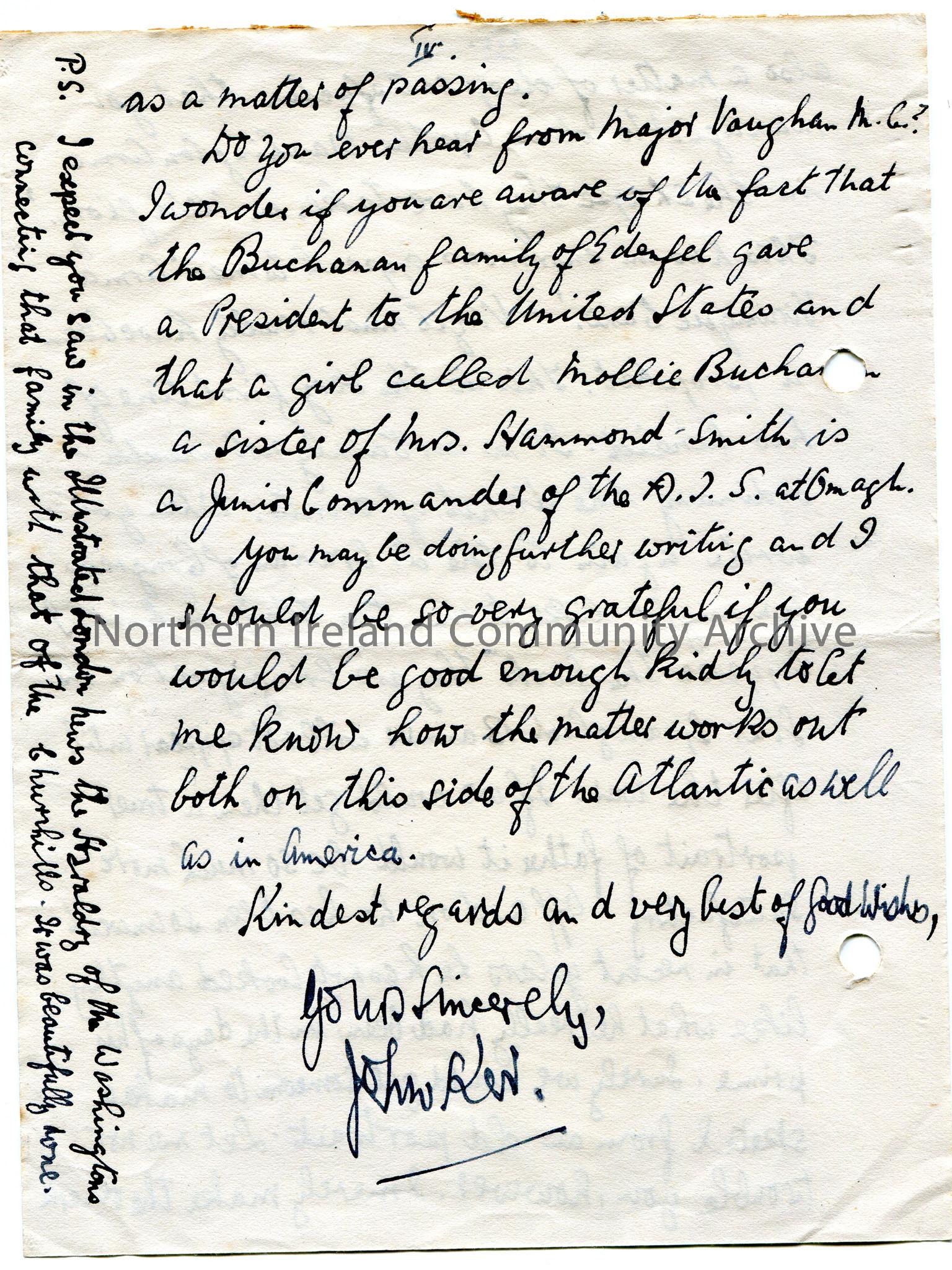 Page 2 of 2. Handwritten letter to Sam Henry. Congratulates Sam on his 'magnificent' article in 'The Telegraph'. Gives it praise and has been received well. Writes of his father being a 'successful leader'. Glad Sam was able to develop the 'Washington Arms' in 'old glory'. Refers to the poet Virgil and his 'Aeneid' which begins with 'Arma Virumque Cano'. Mentions the Library of Congress and Sam's contact with then re 'The Star Spangled Banner'. Discusses getting a 'truer' portrait of his father. Asks if Sam has heard from Major Vaughan and if he is aware of the link between the Buchanans of Edenfel and a President of America. Mentions Mollie Buchanan is a sister of Mrs Hammond-Smith and is Junior Commander of the A.I.S. at Omagh. Sam to let him know how the 'matter' works out on 'this side of the Atlantic' and in America. Mentions a connections of the Washingtons and Churchills in the 'Illustrated London news'. Mentions Sir Basil Brooke.