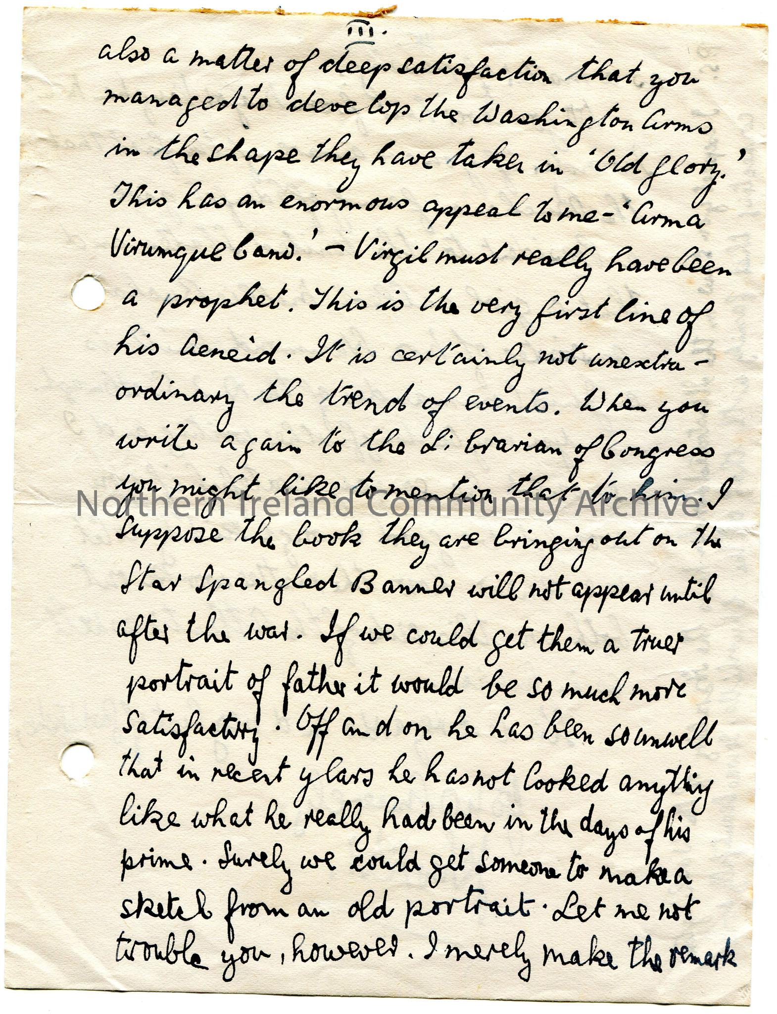 Page 2 of 2. Handwritten letter to Sam Henry. Congratulates Sam on his 'magnificent' article in 'The Telegraph'. Gives it praise and has been received well. Writes of his father being a 'successful leader'. Glad Sam was able to develop the 'Washington Arms' in 'old glory'. Refers to the poet Virgil and his 'Aeneid' which begins with 'Arma Virumque Cano'. Mentions the Library of Congress and Sam's contact with then re 'The Star Spangled Banner'. Discusses getting a 'truer' portrait of his father. Asks if Sam has heard from Major Vaughan and if he is aware of the link between the Buchanans of Edenfel and a President of America. Mentions Mollie Buchanan is a sister of Mrs Hammond-Smith and is Junior Commander of the A.I.S. at Omagh. Sam to let him know how the 'matter' works out on 'this side of the Atlantic' and in America. Mentions a connections of the Washingtons and Churchills in the 'Illustrated London news'. Mentions Sir Basil Brooke.