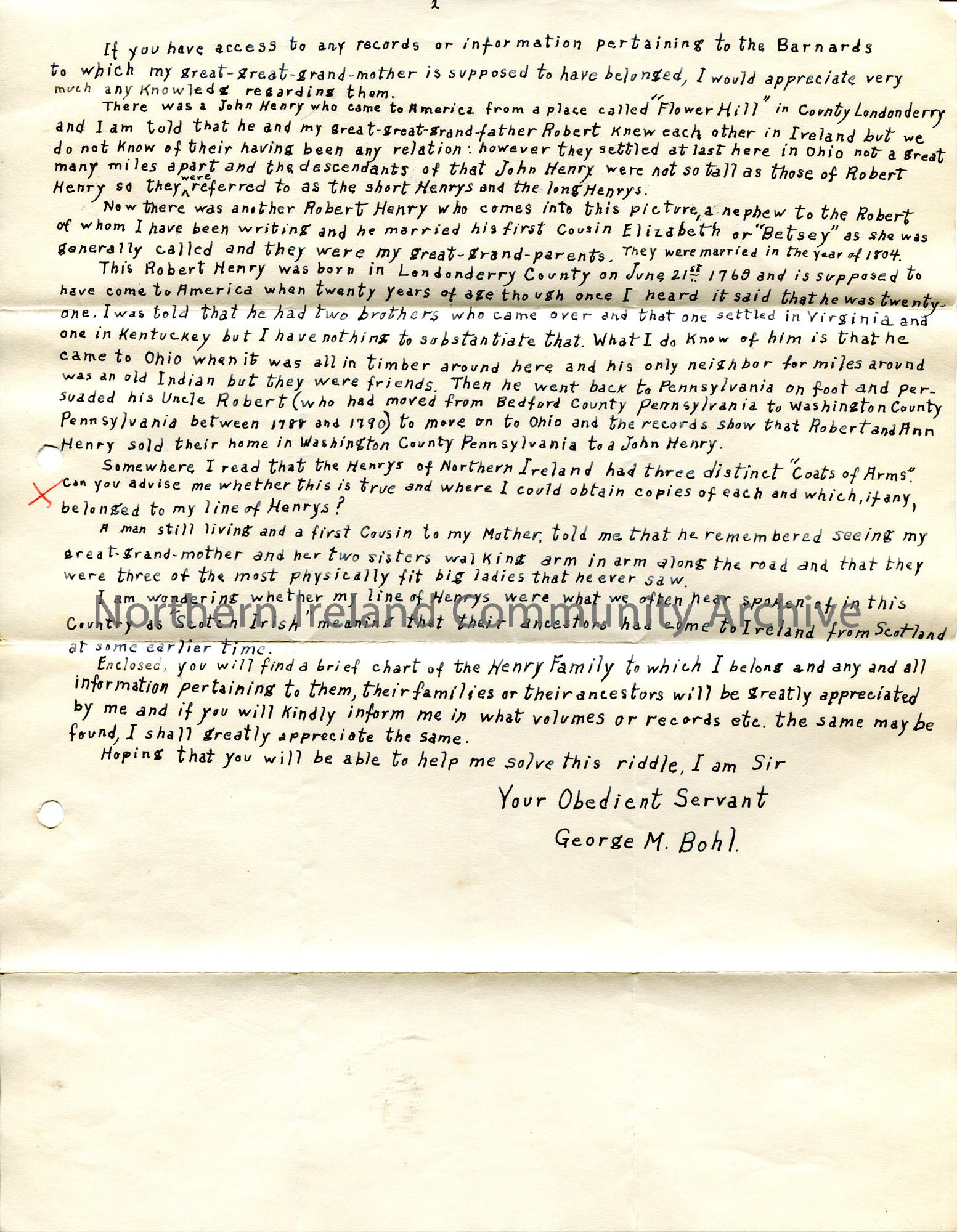 Page 2 of 2. Handwritten letter to Sam Henry, Customs and Excise, Bushmills from George M. Bohl. Requests family history information on the Henry family and Barnard family. Notes that members of his family emigrated to America in 18th Century. Encloses family tree of the Henry family.